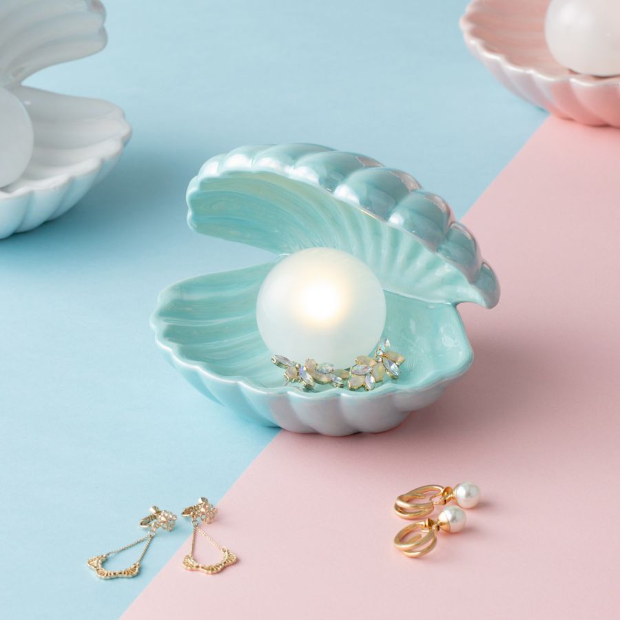 人気の「シェルランプ」(2900円)にトレンドカラーのミントが登場。ライトをつけると貝殻の上蓋部分が影となり、パールがきれいに光ります。ライト部分とシェルが分かれているので、ライトをはずして貝殻のオブジェ、アクセサリー置きとしても使える小ぶりなテーブルランプです。