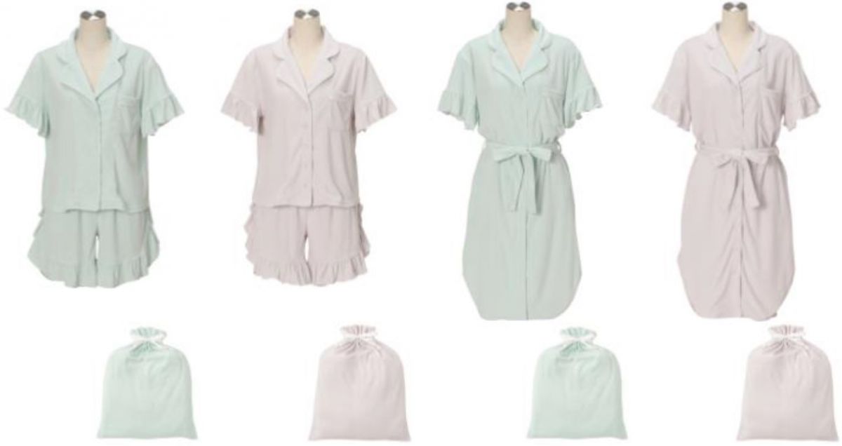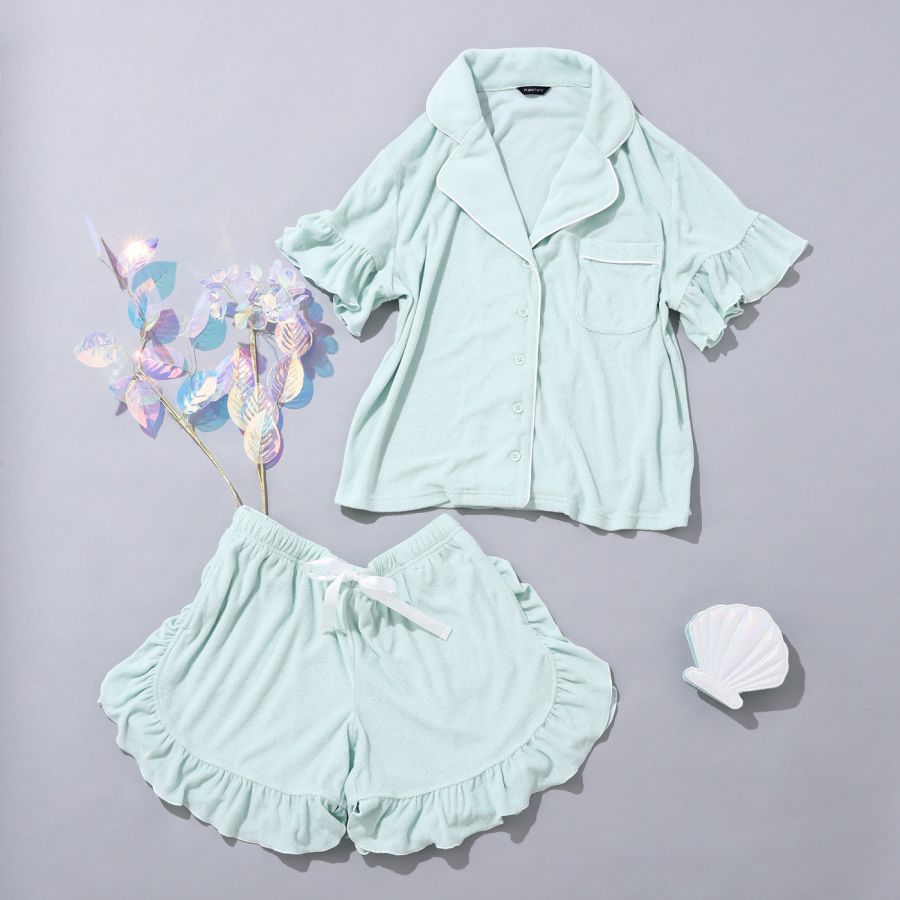 「パイルパジャマ」(左)と「パイルワンピース」(右)各5000円は、ミントとアイスの2色展開。汗などの水分と湿度をよく吸水するパイル生地を使用。ふんわりとやさしい肌触りで快適に過ごしやすく、ギフトにも贈りやすい巾着ポーチ付きです。