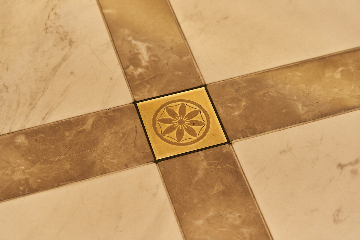 ゲストを迎えてくれるロビーの床には、「旅人の喜び」が花言葉のクレマチスをかたどった真鍮が。「お客様がホテル内で快適にお過ごしいただけるように」との願いが込められているそうです。