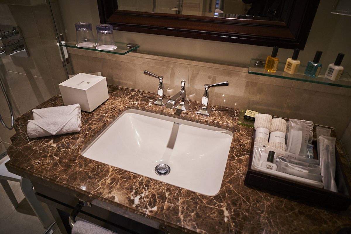 洗面スペースとバスルームはセパレートタイプでゆったり。大理石の洗面台には、充実したアメニティが用意されています。なかでも女子が気になるのは、シャンプーやシャワージェルなどのバスアメニティですよね。「東京ステーションホテル」は、アジアのホテルとしては初めてフランスの「HISTOIRES de PARFUMS(イストワール ドゥ パルファン)」とコラボレーション。歴史やストーリーを香りで表現した“肌で読む本”をコンセプトにコレクションを展開するブランドがオートクチュールで作った「Est. 1915」を楽しめます。