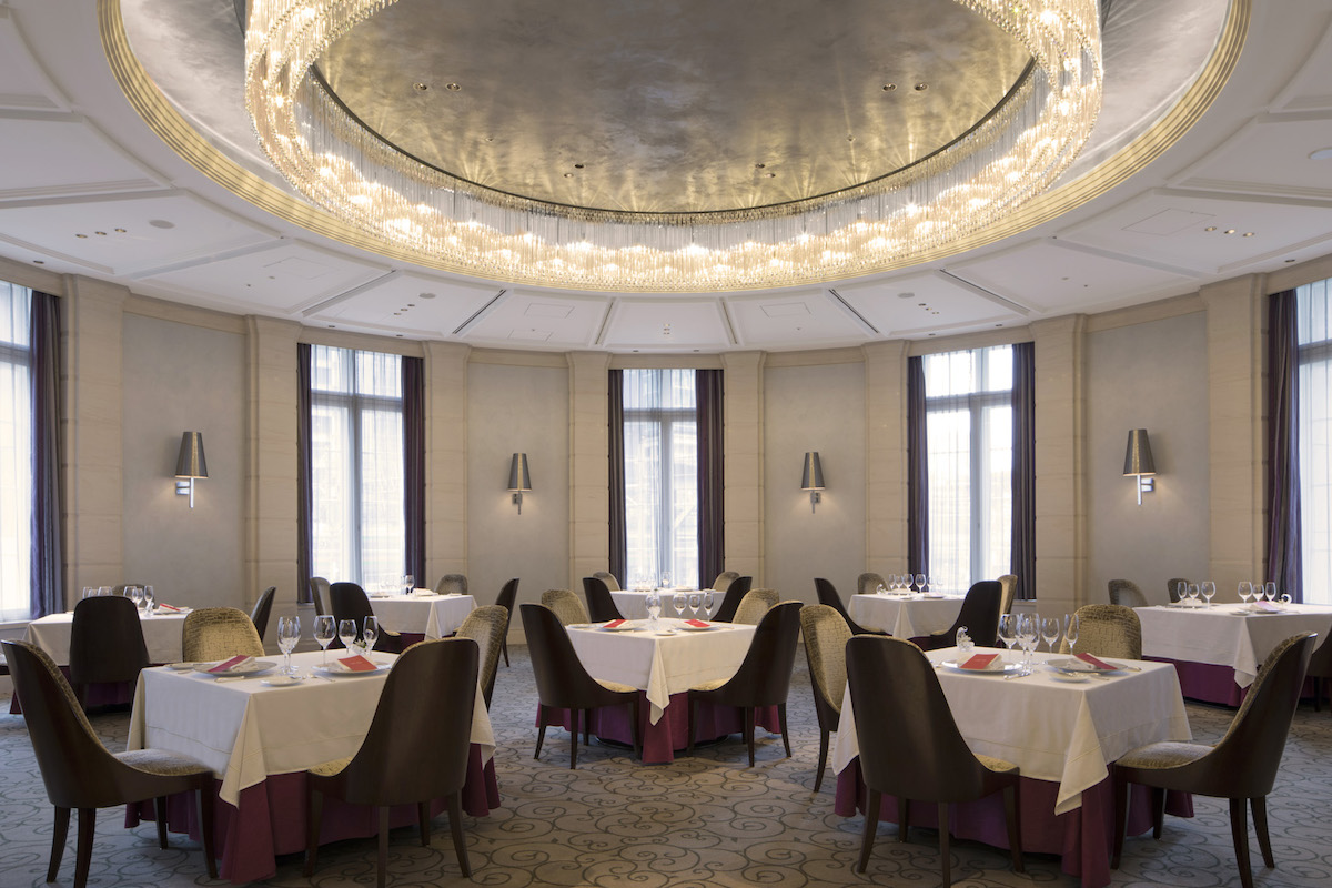 メインダイニング「ブラン ルージュ」では、全国各地の厳選した旬の食材をフランス料理の正統な技法で調理した“日本のフランス料理”を提供。窓際の一部の席からは、電車が行き交う様子を見ることができます。
