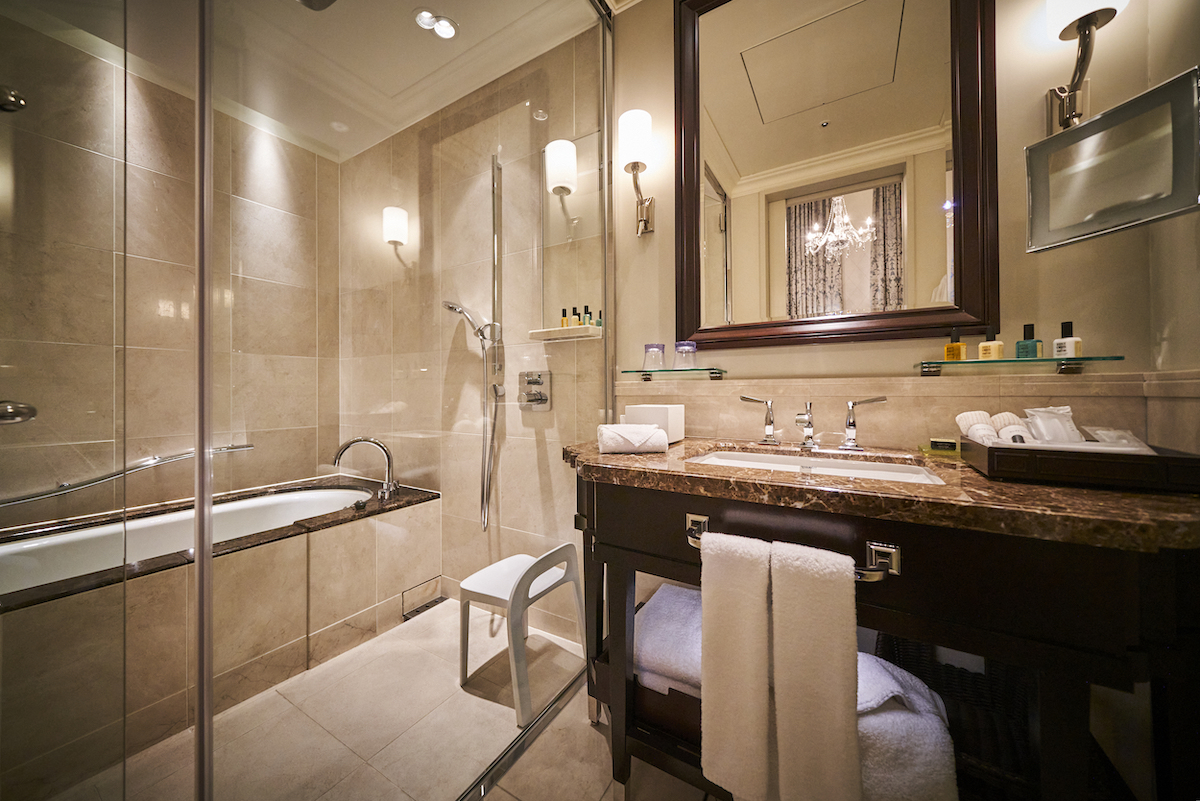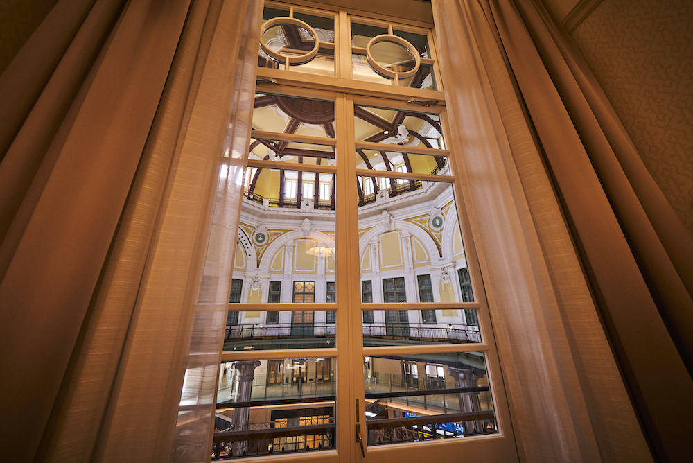 この客室の最大のポイントは、高さ3.9mという天井まである縦長の窓からの眺め。建築家・辰野金吾がデザインした美しいドームレリーフが目の前に広がり、独り占めしているかのよう。ブルー&シルバーを基調にした上品なインテリアと窓の外のクリームイエロー&白の景色は異国情緒にあふれ、東京の真ん中にいながらどこか外国を旅している気分になってきます。