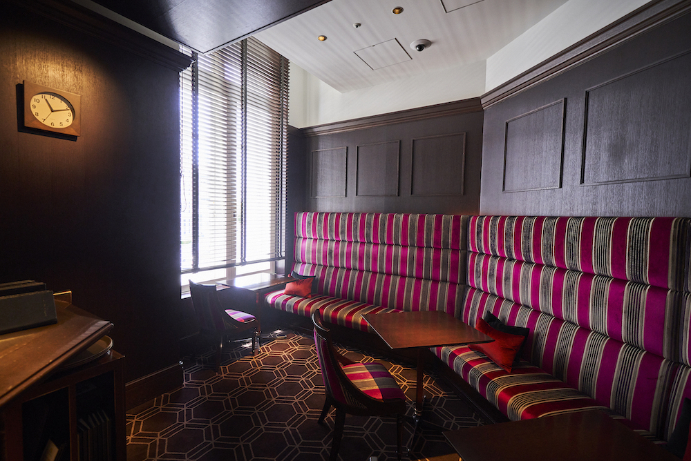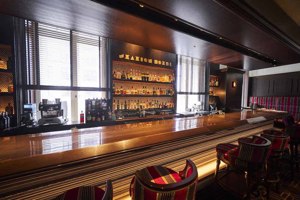 1951年、戦後のホテル再開業時に誕生した「カメリア」。内装は茶×真紅のストライプというモダンクラシックなものに一新されましたが、バックバーにはオープン当時に使われていた切り文字ロゴの「STATION HOTEL」が飾られています。
