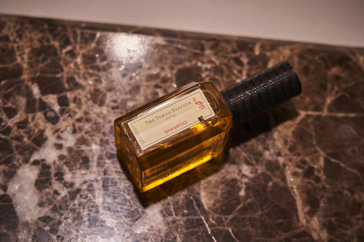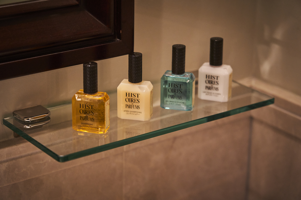 もうひとつ癒しをもたらしてくれるのが、フランスの香水ブランド「HISTOIRES de PARFUMS de PARFUMS(イストワール ドゥ パルファン)」とのコラボレーションで作られたアメニティ。使うとホテルの歴史をイメージした甘くやさしい香りにふんわりと包まれます。名前は「Est. 1915」という開業年、ボトルの側面のシールは改札鋏の入った切符がモチーフと、ここにもストーリーがあるのです。