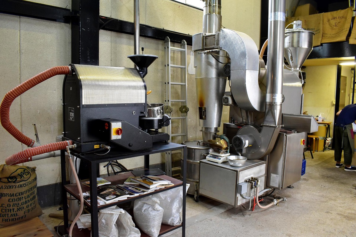 店内に足を踏み入れると、コーヒーの香りに満たされたインダストリアルな空間が広がっています。一度に35kgまで焙煎できるというアメリカ製の巨大ロースター(写真奥)が設置されていて、いかにもおいしいコーヒーがいただけそう! なんと、清澄白河にある「ブルーボトルコーヒー」の当時のオーナーも、上陸前にこちらを訪問したといいます。