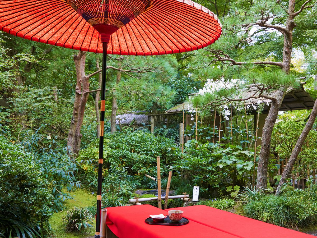 晴れた日にはお庭に野点傘と緋毛氈(ひもうせん)の茶席が用意されるので、「明月院」の緑を愛でながらぜひ!耳を澄ますと「水琴窟」の美しく神秘的な音色も楽しめますよ。