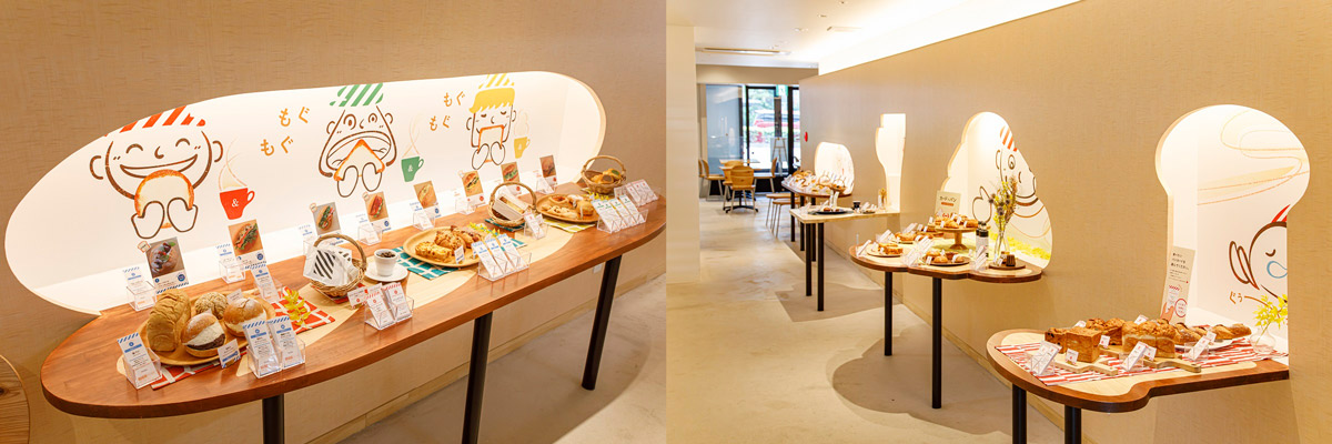 通路に沿って4つのテーブルが並び、サンプルのパンが陳列されています。トングやトレーは使わず、欲しいパンのカードを手に取って、店内奥のレジで会計するシステム。購入直前までパンが厨房にあるから、接触や飛沫が気にならないのが嬉しいですね。テーブルはパン型で、壁にも絵本のようなイラストが描かれているのがかわいい!