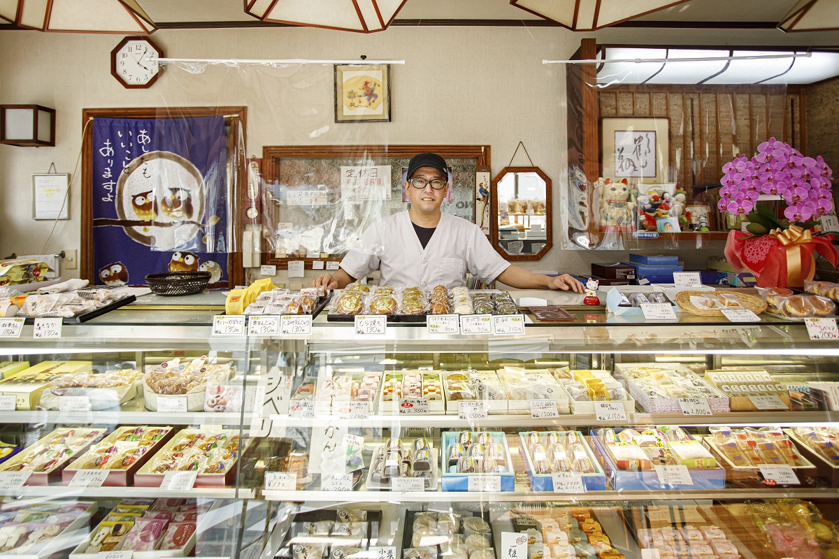 ショーケースの中にも上にも、20~30種類の商品がずらり。ほとんどが店内奥の工房で作る自家製のものです。2代目店主の飯川大進さんは元パティシエで、和洋折衷のお菓子作りに注力しています。