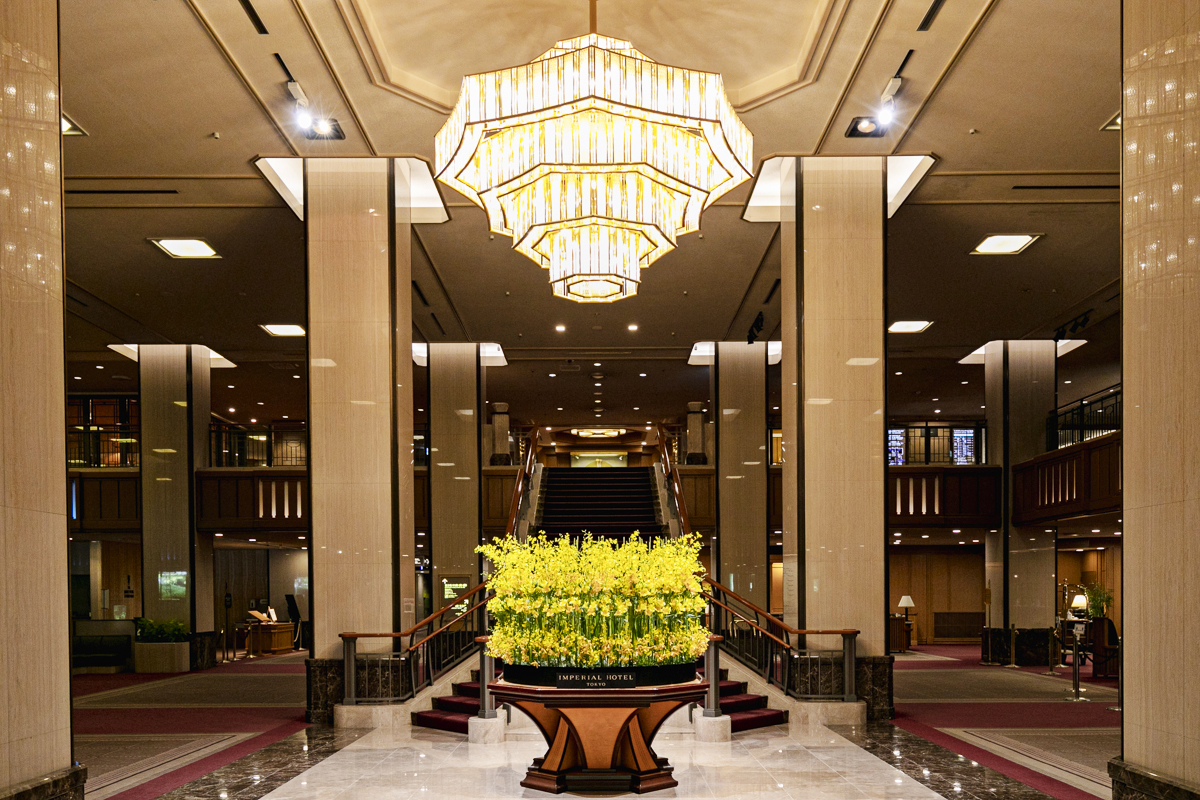 エントランスを抜けたメインロビーでは、大きな装花と煌びやかなシャンデリアがお出迎え。季節ごとに変わるという装花、4月の取材時はアルストロメリアやオンシジューム、モカラのイエローカラーでまとめられていました。春らしい色合いは華やかで見ているだけで元気になりそう。そして天井に輝くシャンデリアは、368枚の淡黄色ガラス板を使用した、彫刻家・多田美波さんの芸術作品「ゴールデンローズ」です。重厚で気品に溢れた姿はホテルの象徴ともいえます。
