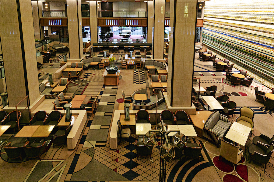 1923年に完成した2代目本館(通称“ライト館”)を設計した、近代建築の巨匠、フランク・ロイド・ライトのデザインをモチーフにした幾何学模様の絨毯もおしゃれ!ラウンジ全景を眺めるなら中2階へ行ってみて。