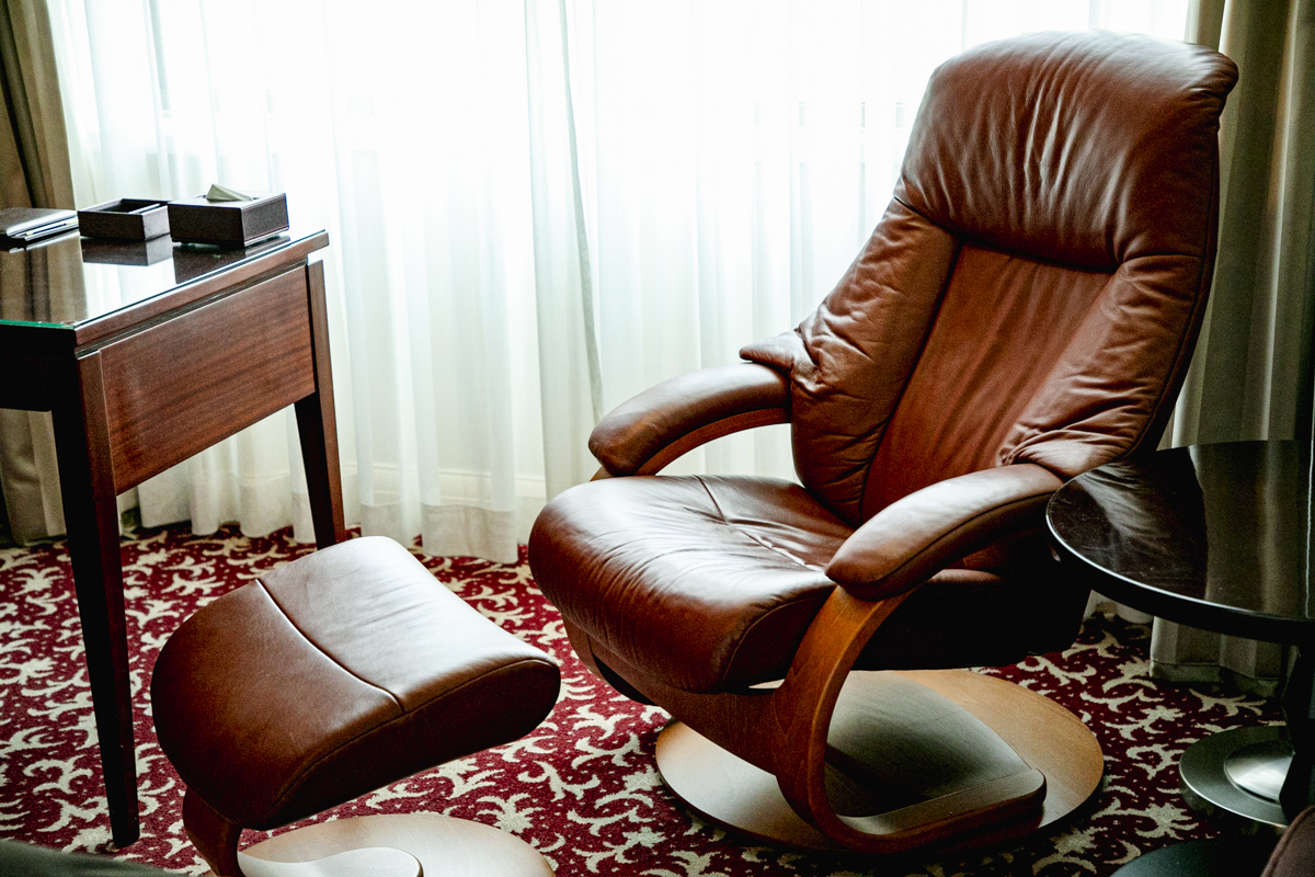 デラックスルームの広さは42㎡。ペイズリー柄の赤い絨毯に重厚で落ち着いた色合いのインテリアが歴史あるホテルを物語っています。快適な眠りへと誘うオリジナルのベッドとデュベ、エスプレッソマシーンにBluetooth対応のBOSEスピーカーなど、居心地にこだわった設備は申し分なし!本革張りのリクライニングチェアの座り心地も抜群です。