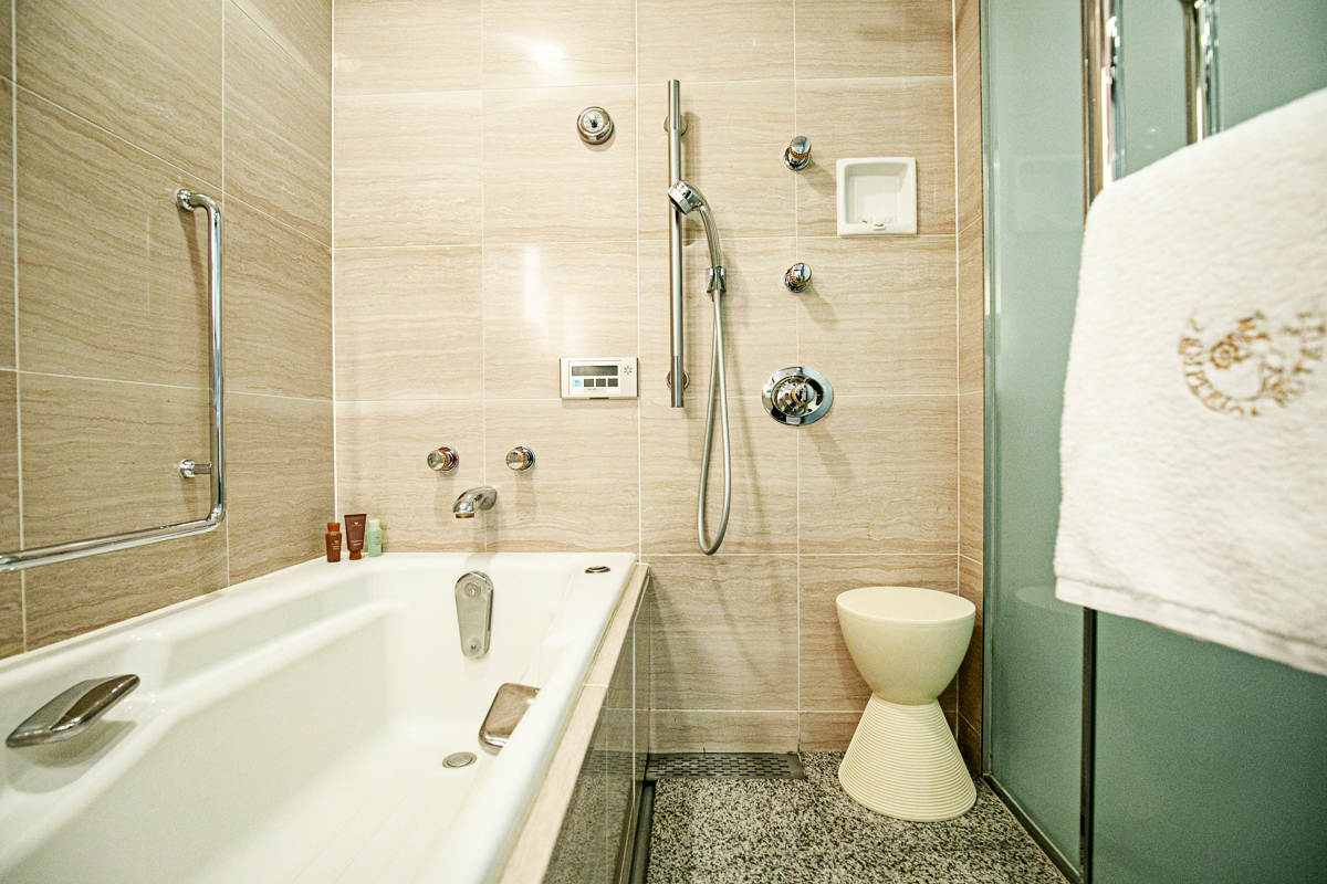 バスルームはシャワーエリアとバスタブ一体型。レインシャワーにバスチェア、温度・湯量を自由に設定できる自動給湯機能も完備しています。パウダールームには液晶テレビもあるのでお化粧しながらテレビ鑑賞もできちゃいます。