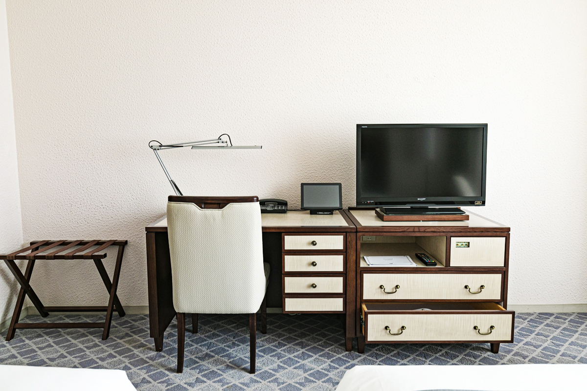ステイケーションにもぴったりなデスクもあります。インターネット無料接続はもちろん、USBポート、さらにホテル内のあらゆる情報を配信する「帝国ホテル 東京」専用のタブレット端末も完備。バーは何時まで営業している?部屋でマッサージはできる?などデスクに居ながらホテルのさまざまな情報を確認できます。