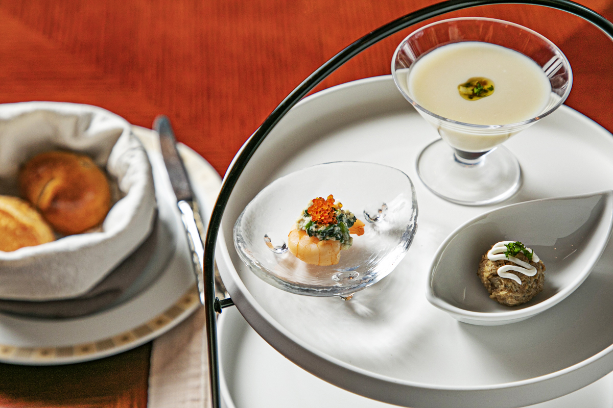 最初に提供されるオードブルスタンド。この日は小海老と春菊の白和え とびっ子添え、ニシンの燻製と玉葱のサワークリームソース、カリフラワーの冷静スープ生ハムとレーズンの3種。季節の食材を使った上品な味わいのオードブルを堪能しつつ、タブレット端末でオーダーした料理を待ちましょう。