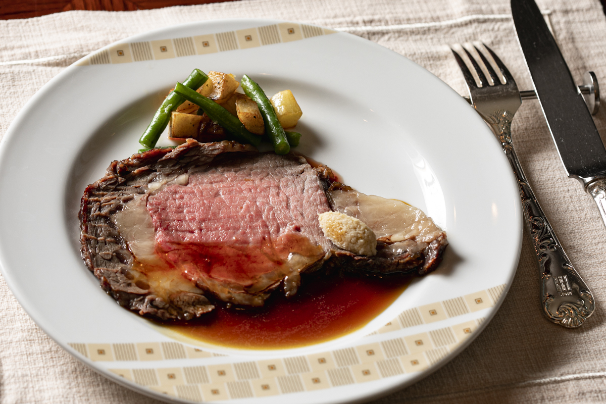 テーブルに着くと冷前菜とパンのオードブルスタンドが提供されます。季節の食材を使った上品な味わいのオードブルを堪能しつつ、タブレット端末でオーダーした料理を待ちます。月替わりを含めて40種類ほどあるメニューのなかで特に気に入ったのは、「ローストビーフ」。肉の旨味と濃厚なグレービーソース、西洋ワサビの爽やかな辛さがベストマッチの逸品。注文を受けてから作るので、出来立てを味わえるのも嬉しいポイントです。