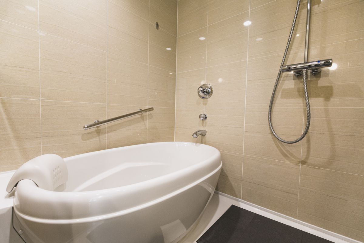 バスルームは一部、スタイリッシュにリノベーションされています。ぽてっと丸みを帯びたバスタブにはバスピローが付いているので、よりリラックスできそう!「L'OCCITANE」のバスアメニティとともにくつろぎのバスタイムを。