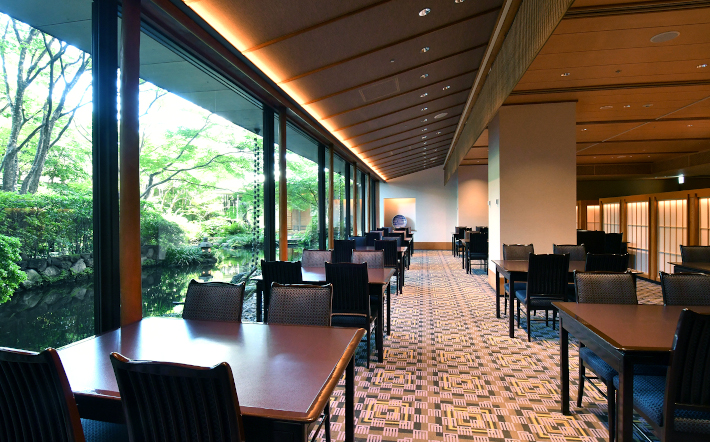 日本庭園を望むレストラン「日本料理 源氏香」では庭園を観賞しながら、ランチは海鮮を使った丼ぶりや昼御膳を、ディナーはすき焼きや会席料理をゆっくり味わえます。和モダンの落ち着いた店内には個室や天婦羅専用カウンターも用意。