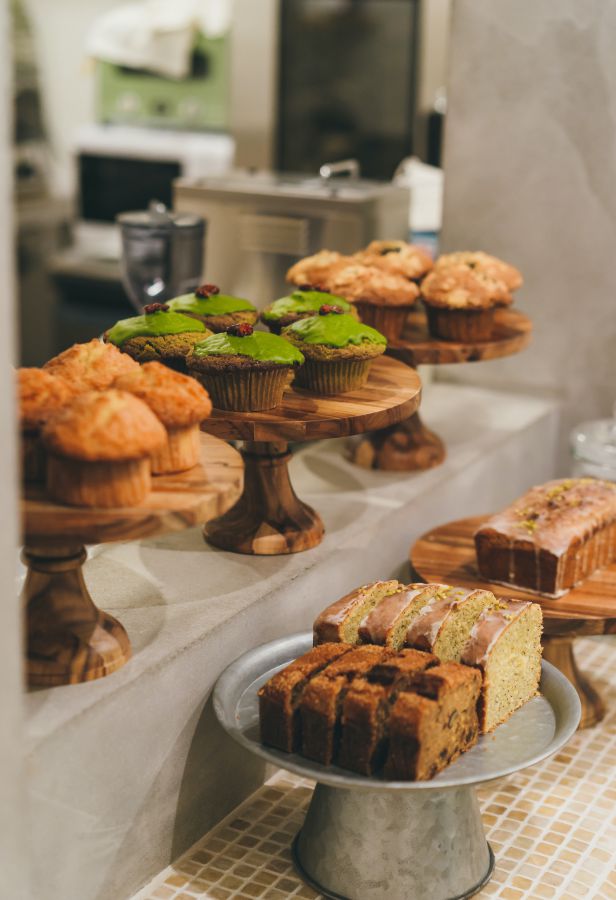 スタンドに並ぶ焼き菓子たち。この日は、抹茶クランベリー・ブルーベリークランブル・バニラときび砂糖のマフィンやバナナ・キャロット・レモン&ポピーシードのパウンドケーキ。どれも国産、オーガニック、アルミニウムフリー、NON GMO(非遺伝子組み換え作物)などこだわりを持って選んだ材料で作られています。