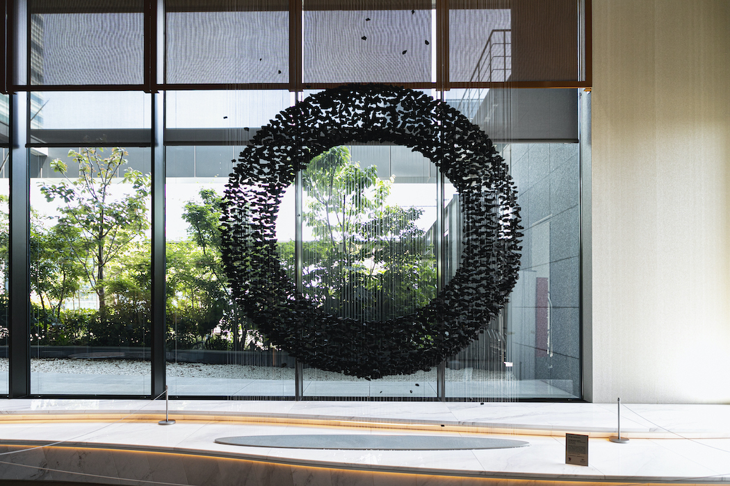 22階ロビーに着くと巨大な円形のインスタレーションがお目見え。こちらは韓国人アーティストのパク・ソンギによるアート作品です。「アスコット丸の内東京」には世界各国のアーティストの作品が随所に飾られているので、ちょっとした美術館みたい!