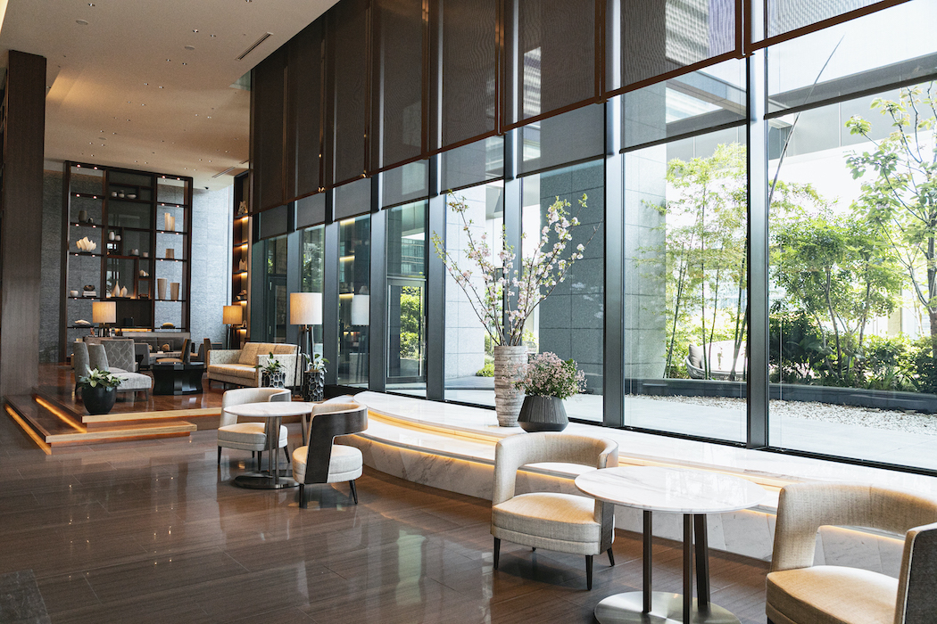 天井高約8mのロビーは圧倒的な開放空間!大きな窓の外には植物の緑が広がり、都心にいることを忘れてしまいそうな心地よさ。季節の花も飾られ、おもてなしの心も感じられます。