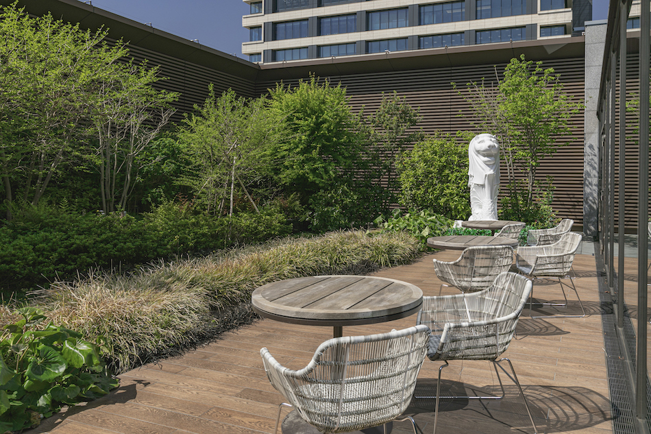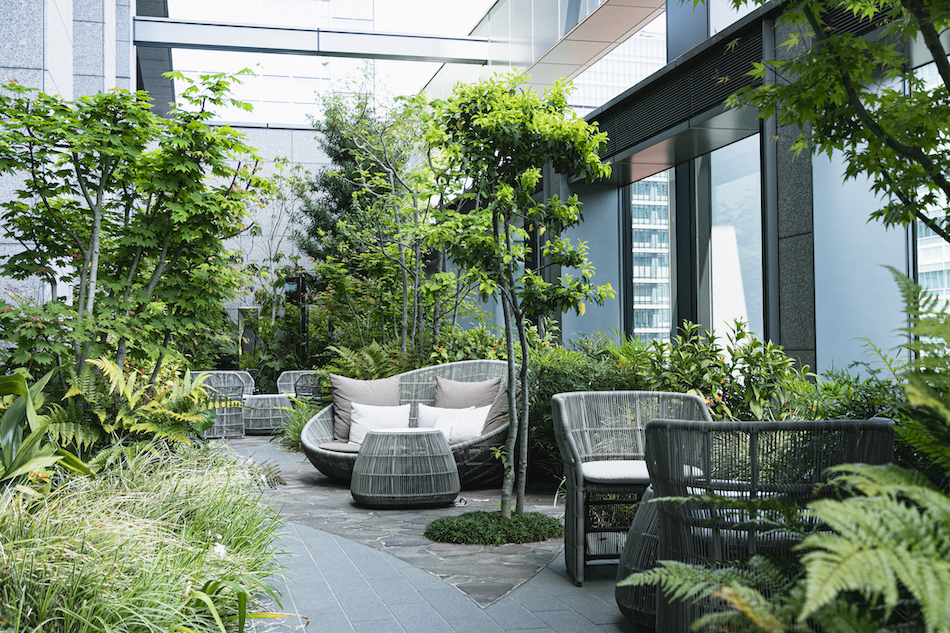 ラウンジの外には多種多彩な植物に囲まれたオープンエアのテラスがあります。アジアンテイストのソファやイスもあり、リゾート気分満載の雰囲気で、グリーンに癒やされながらくつろげます。ブランケットの用意もあるので肌寒いときも安心。
