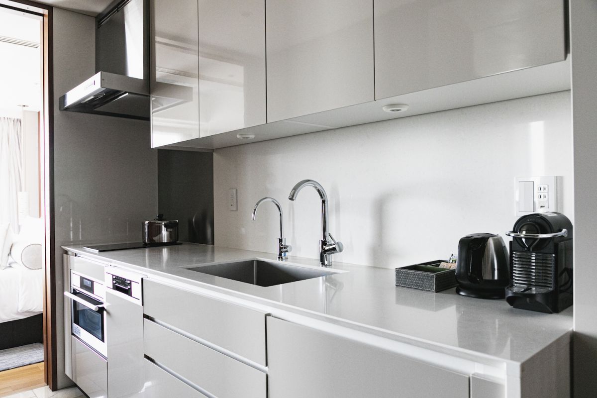キッチン設備もすごい!冷蔵庫に食器洗い機、IHヒーター、オーブンレンジ、コーヒーメーカー、電気ケトル、希望に応じて炊飯器も用意してくれます。キッチンなしや簡易キッチンの客室もあるので、予約時に確認を。