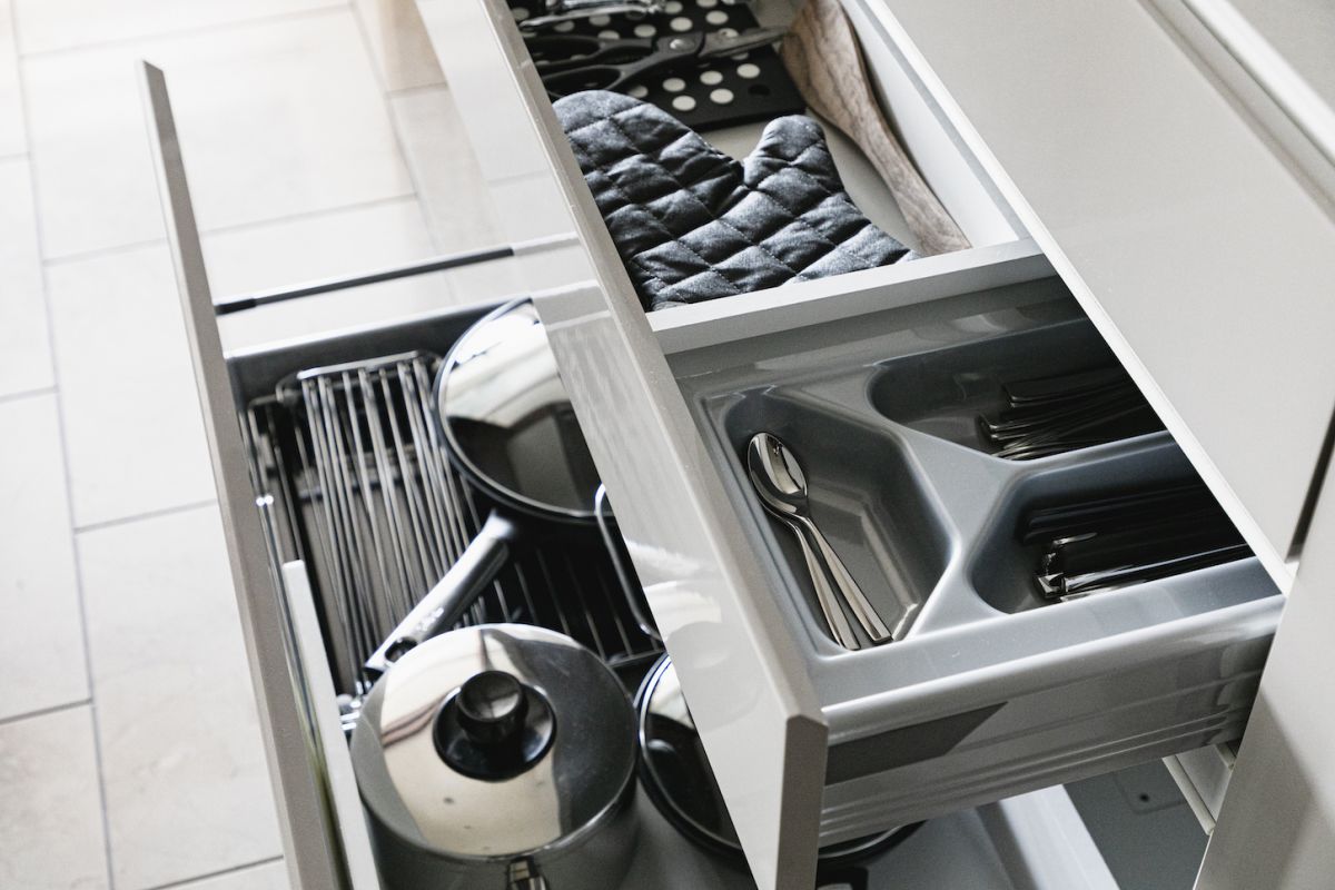 引き出しには調理器具一式とカトラリー、上の棚には食器皿やコップ、グラスがあるので、料理をすることもできます。ただし、調味料はないので要持参。徒歩圏内にスーパーマーケットが数軒あるので、食材を調達してチェックインするのもいいですね。