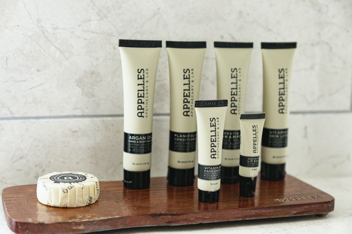 バスアメニティはオーガニック原料を使ったオーストラリアのスキンケアブランド「APPELLES(アペレス)」。ハンドクリームとリップバームまであるのはかなりうれしい!
