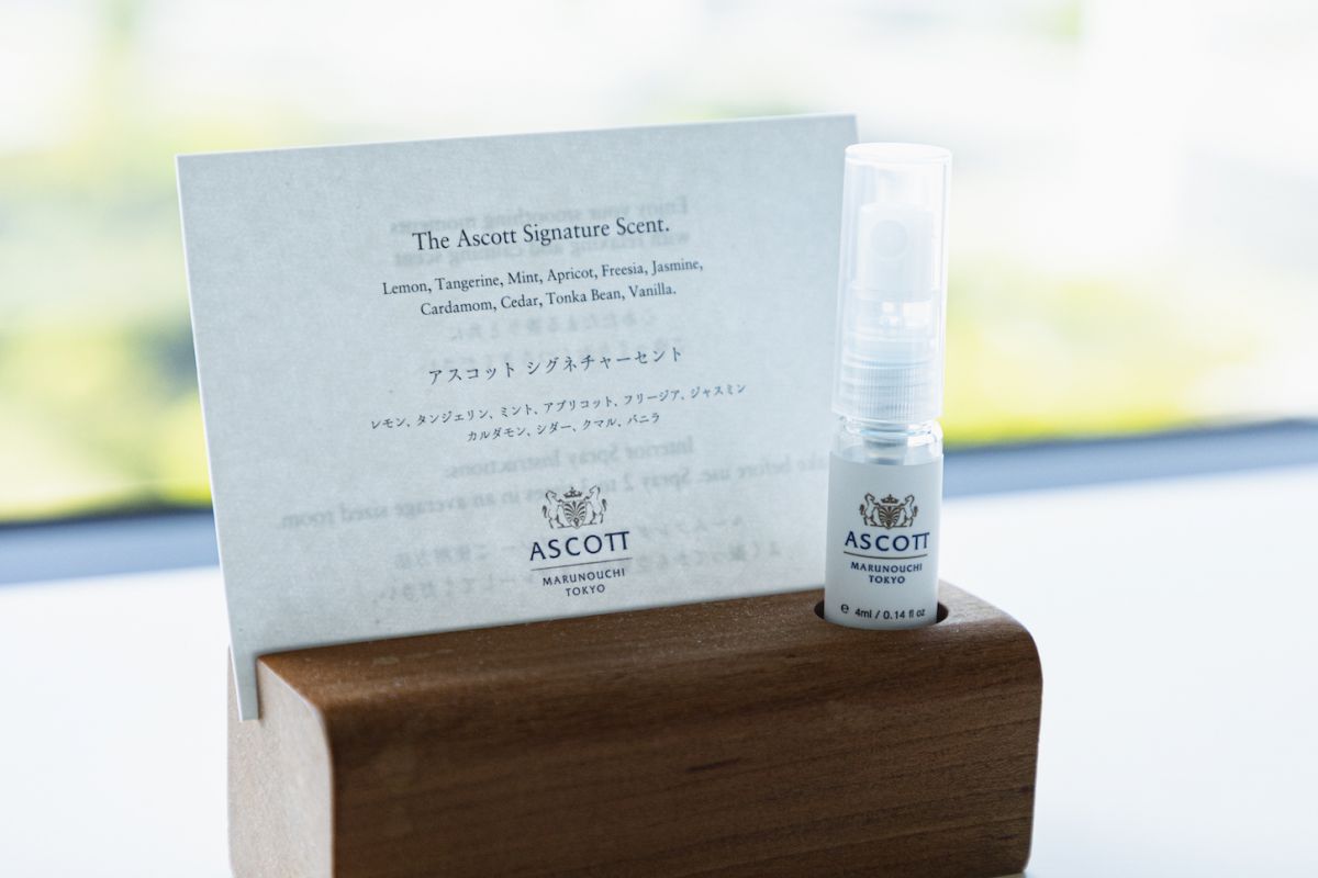 もうひとつうれしいアメニティがベッドサイドに。レモンやアプリコット、カルダモンなど10種類の果実やフラワーをブレンドした、アスコットオリジナルのルームフレグランススプレー「アスコット シグネチャーセント」。柑橘系の爽やかな香りが部屋全体に広がり、リラックス効果も高まりそう。