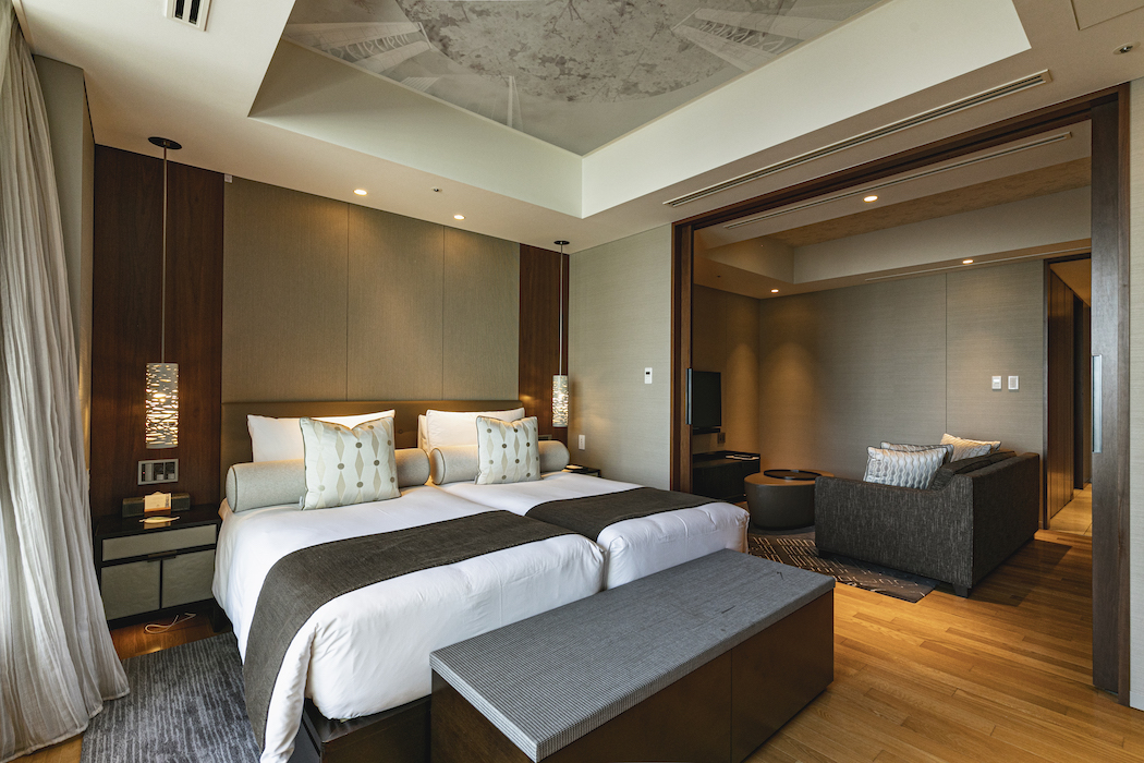 2名でゆったりステイするなら「1ベッドルームデラックスツイン」はいかが。シングルベッドを2台置く寝室とリビングルームの2部屋にキッチン、バスルームが付いた54㎡の広々空間。寝室とリビングの間には仕切りもあるので、使い勝手もいいですね。