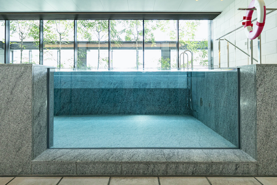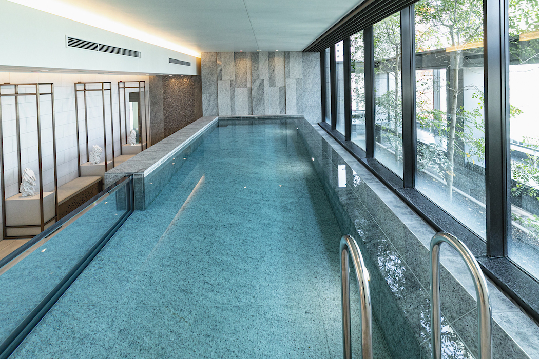エクササイズプールは長さ8.5m、幅2.8mとコンパクトですが、一部スケルトンになった造りと、高層ビルを背景にしたインフィニティ仕様のモダンなデザインが楽しめます。