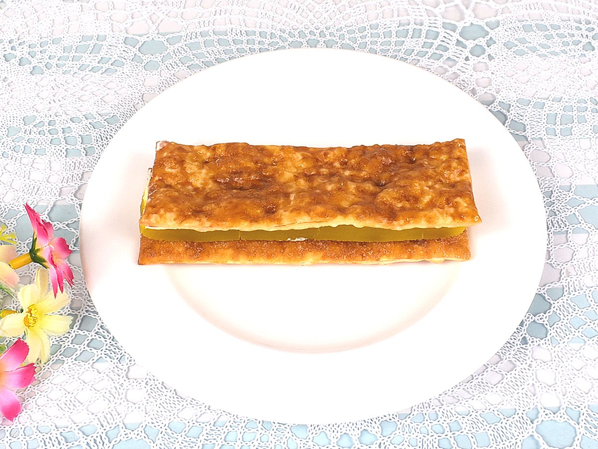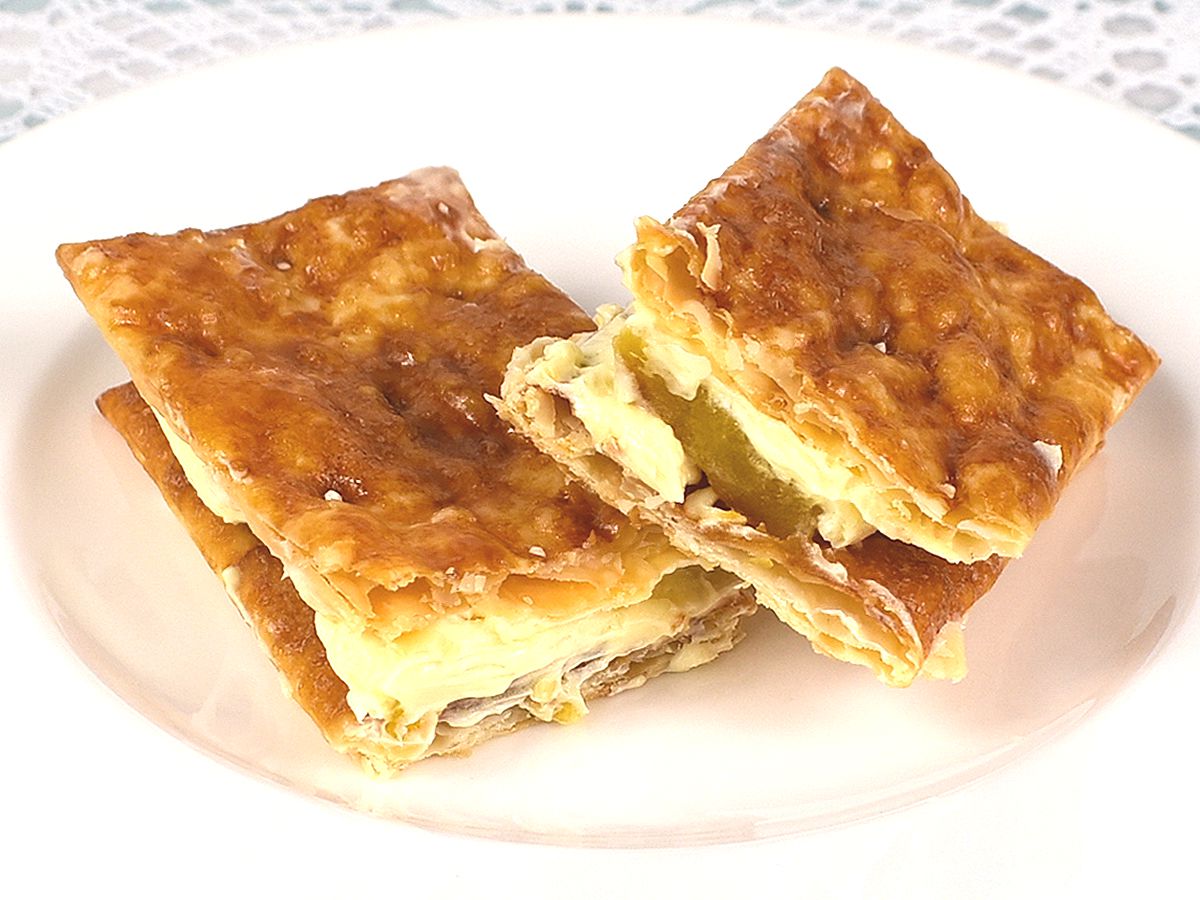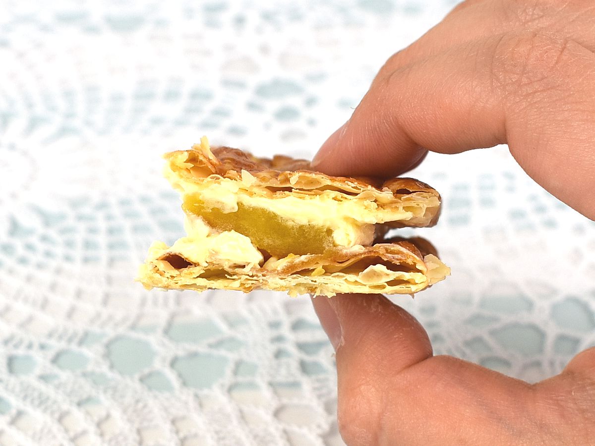 こんがりと色づいたキャラメリゼされたパイ生地の間から、濃い黄色のスイートポテト餡がチラリ。なめらかな舌触りのスイートポテトと、サクサク食感のパイがどんなコンビネーションを見せるのか、ワクワクします。
