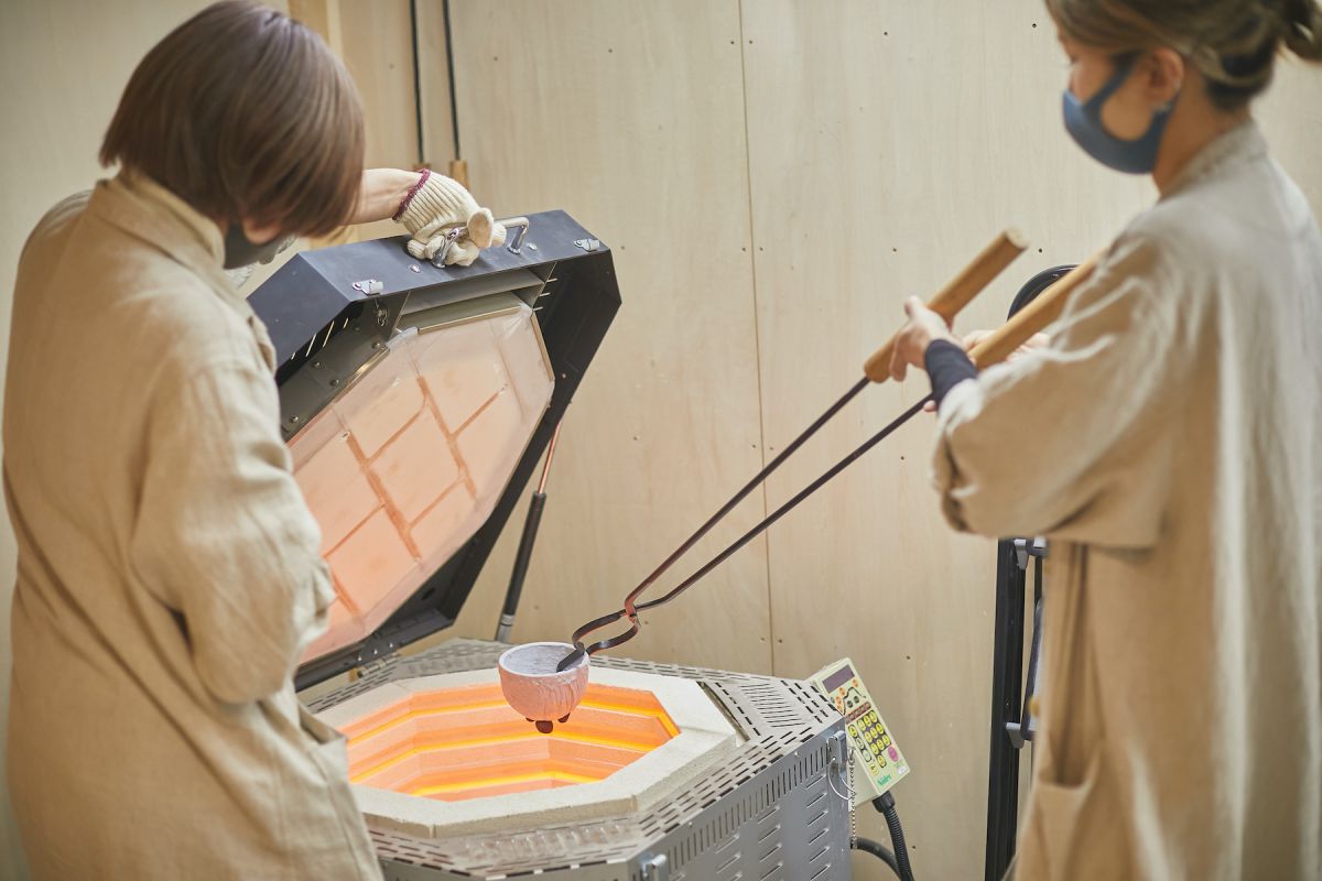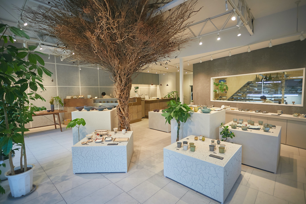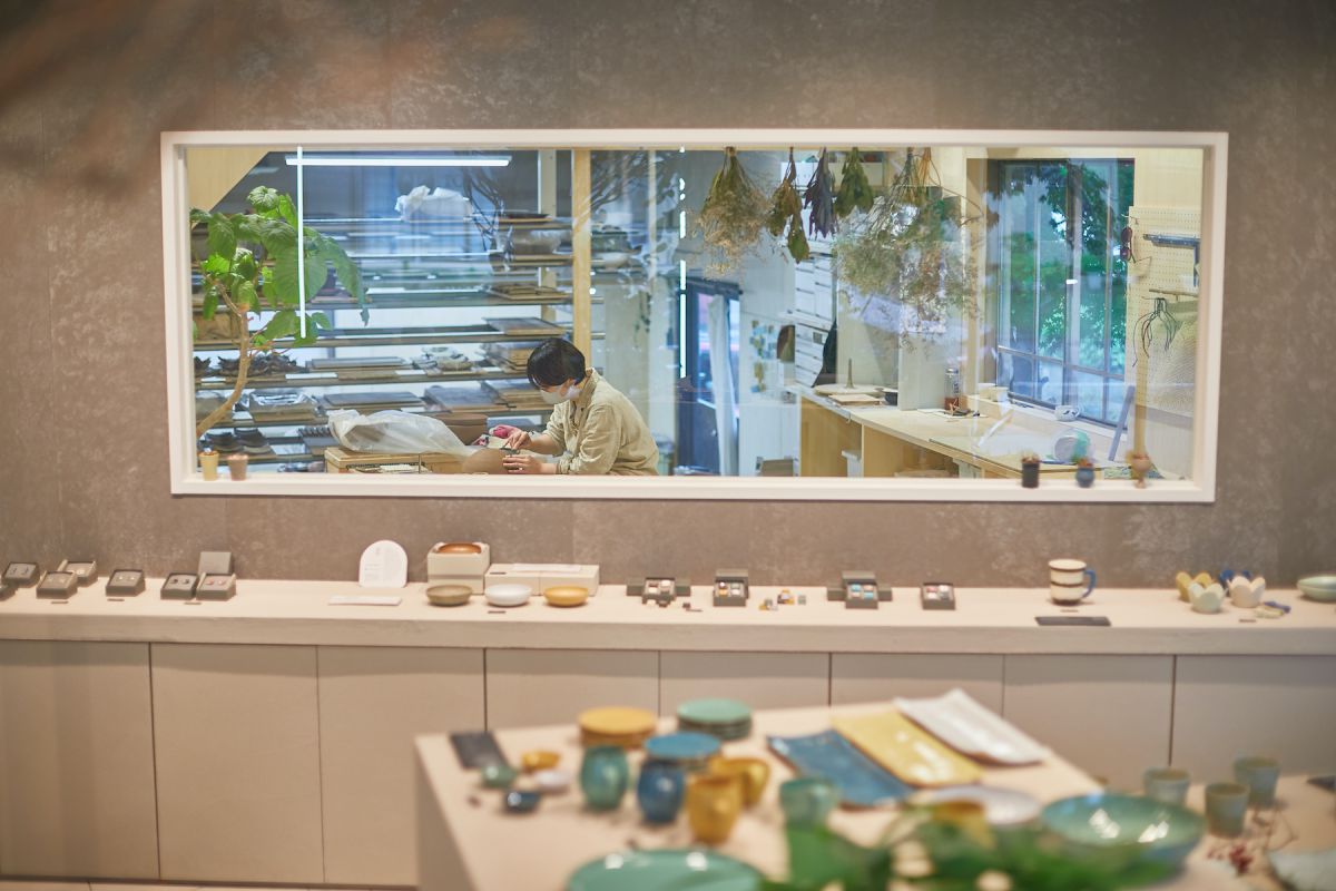 店内の真ん中に工房がある不思議な造りになっていて、職人さんがショップに並ぶ器を制作している様子がガラス張りになっています。