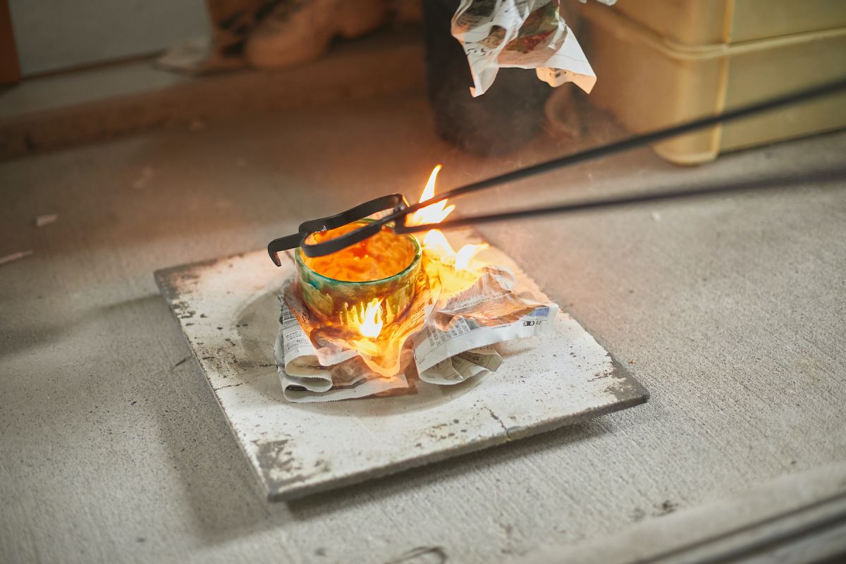 「楽焼(らくやき)」は、お茶で有名な千利休の好みにあわせて楽長次郎が始めたとされる焼き物。こちらでは約900度の低温で焼き上げます。低温で焼くと発色がよい代わりに、釉薬(ゆうやく)がどう変化し、どんな色と模様が浮かび上がるのか? プロでもわからないくらい偶発に左右されるそう。陶芸を極めた人が最後に戻ってくるといわれるほど、予測不能を楽しめるツウな焼き物が「楽焼」なのです。
