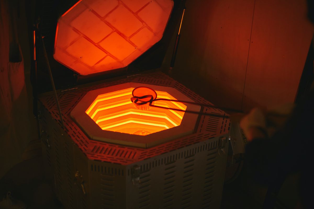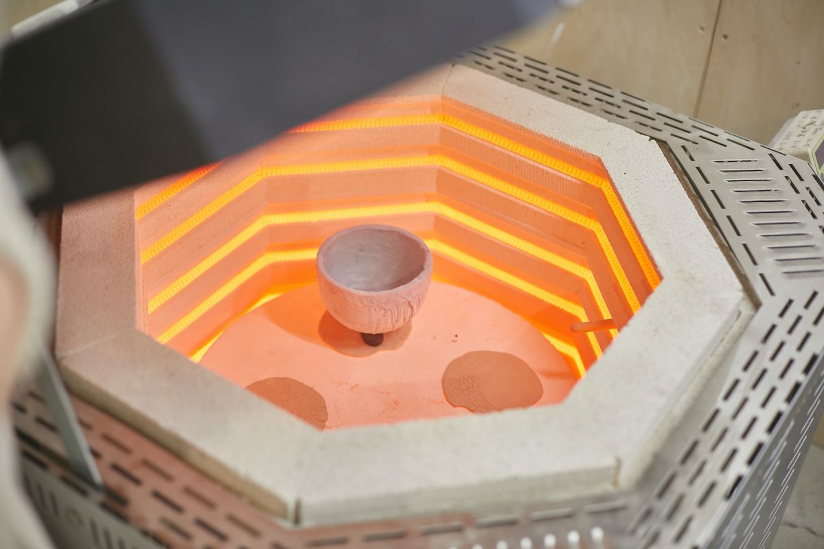 窯の中はこんな様子。真新しい窯に作品を置き、蓋をして熱すること10分ほど。その間に、窯から焼き物を取り出す練習をします。