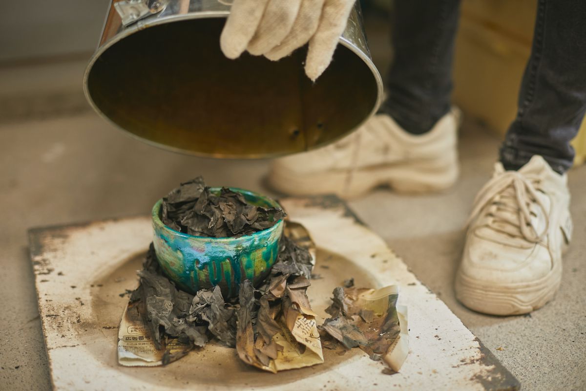 体験では、職人さんが最初から最後までマンツーマンでレクチャーしてくれます。釉薬を薄めに塗れば、緑がかった色に、濃く塗ると青く、釉を塗らずに燻した部分は素地の黒が出てくるそう。見本を見て、個人的にすごく気になったいぶし銀に輝く部分は、最後に燻すときに新聞紙に触れていた部分なのだとか。