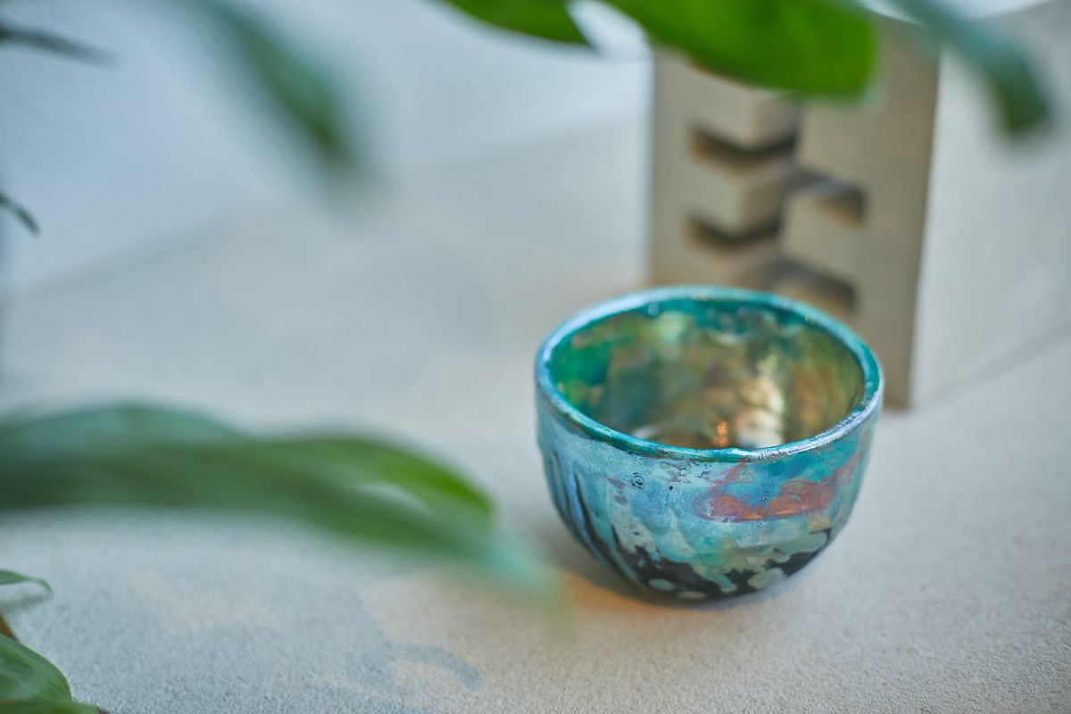 出来上がりの器。カメラマンさんがとても素敵に撮ってくれました。けれど、心の中は後悔でいっぱい…。もっと濃淡をつけたらよかった。薄く1度塗りして緑色出して、そこに雫を垂らせばよかったし、もっとムラを作ればよかった…。色の出方が美しいだけに、時間があればもっと上手にできたのに…と後悔が残ります。きっとみんな、こうやって楽焼にはまるんでしょうね。