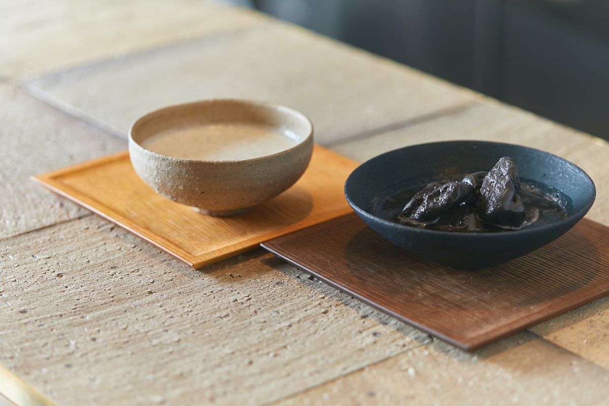 墨汁に炭の塊を置いたかのような見た目のこちらは液体「トキノスミ」(ドリンクです)。味がまったくもって想像できません。おそるおそる口をつけてみると、なんと爽やかなザクロの風味。「視覚では黒く、味覚で赤い印象を受ける」というアーティスト発想なドリンクです。炭の塊に見えるものは、氷ではなくて陶器なので、かじらないように要注意。