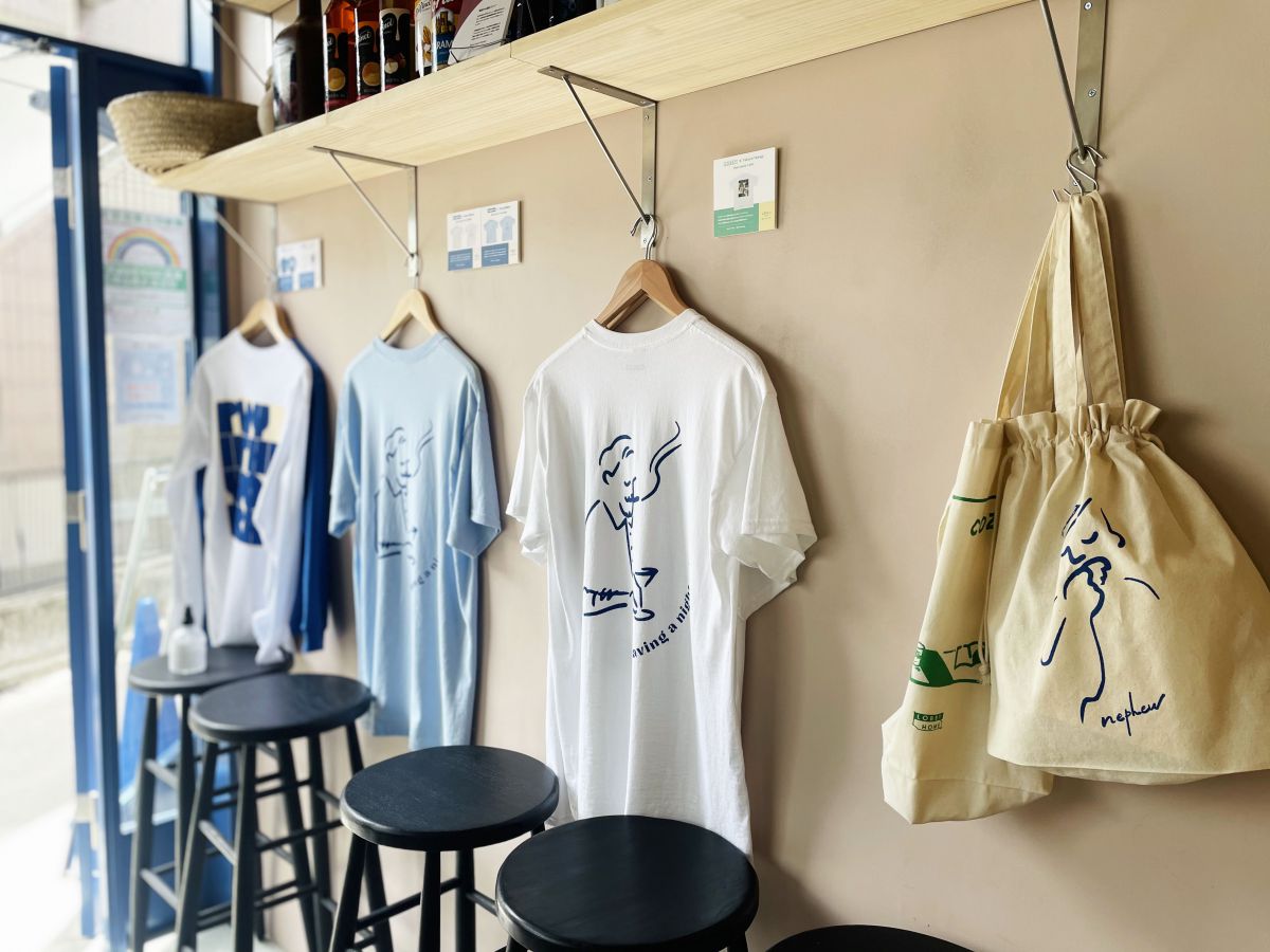 店内では、「nephew」のロゴを使ったオリジナルグッズの販売も。洗練されたシンプルなデザインで、ユニセックスで使えます。