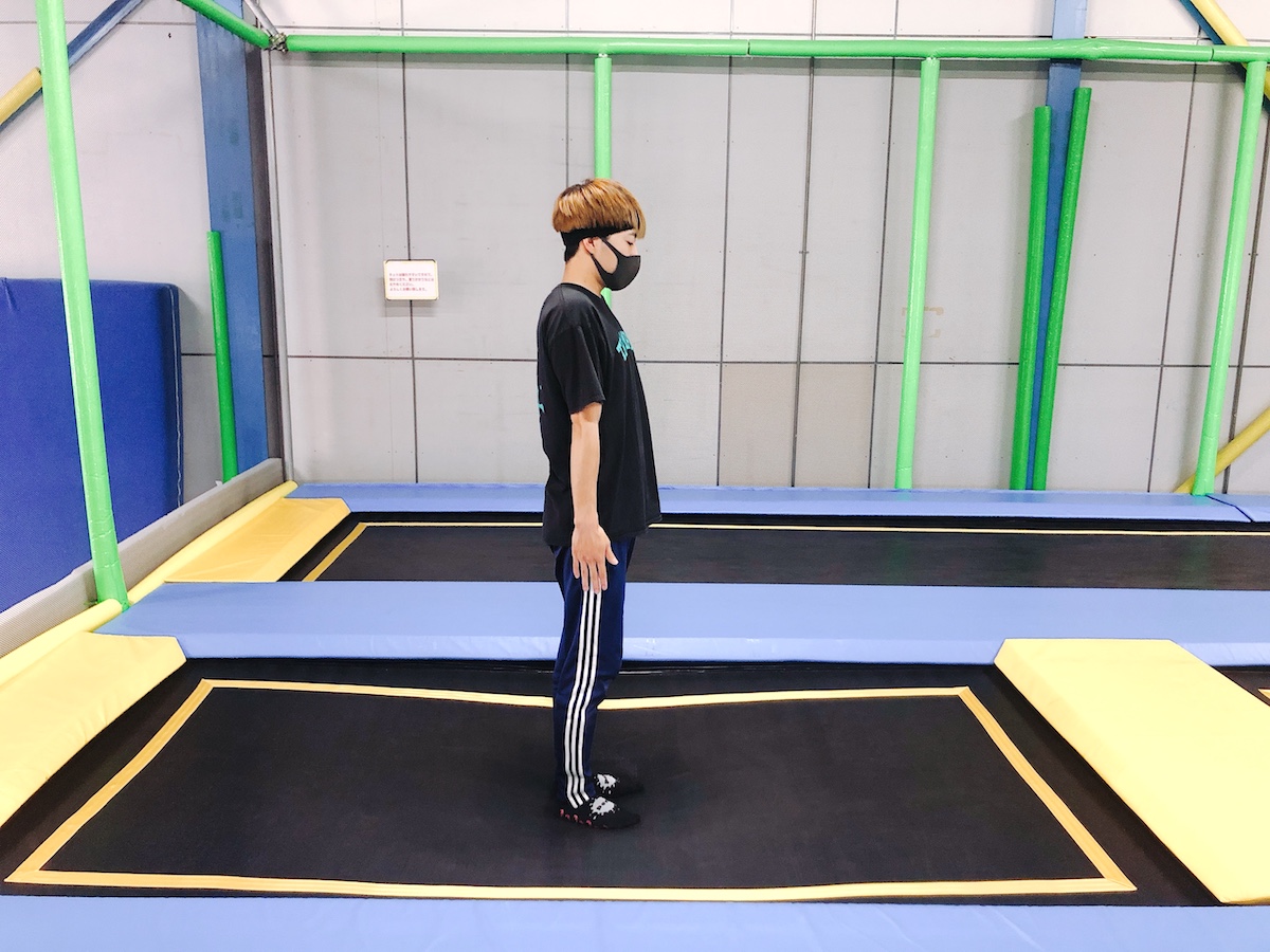 まずは超基本から。姿勢をまっすぐにするのがポイントだそうです。上に跳ぶだけですが、ふわふわとした感覚が普通の床とは全く違います!慣れないうちはちょっと怖いかも…。しかし、何度かチャレンジするうちに、まっすぐ跳べるようになります。