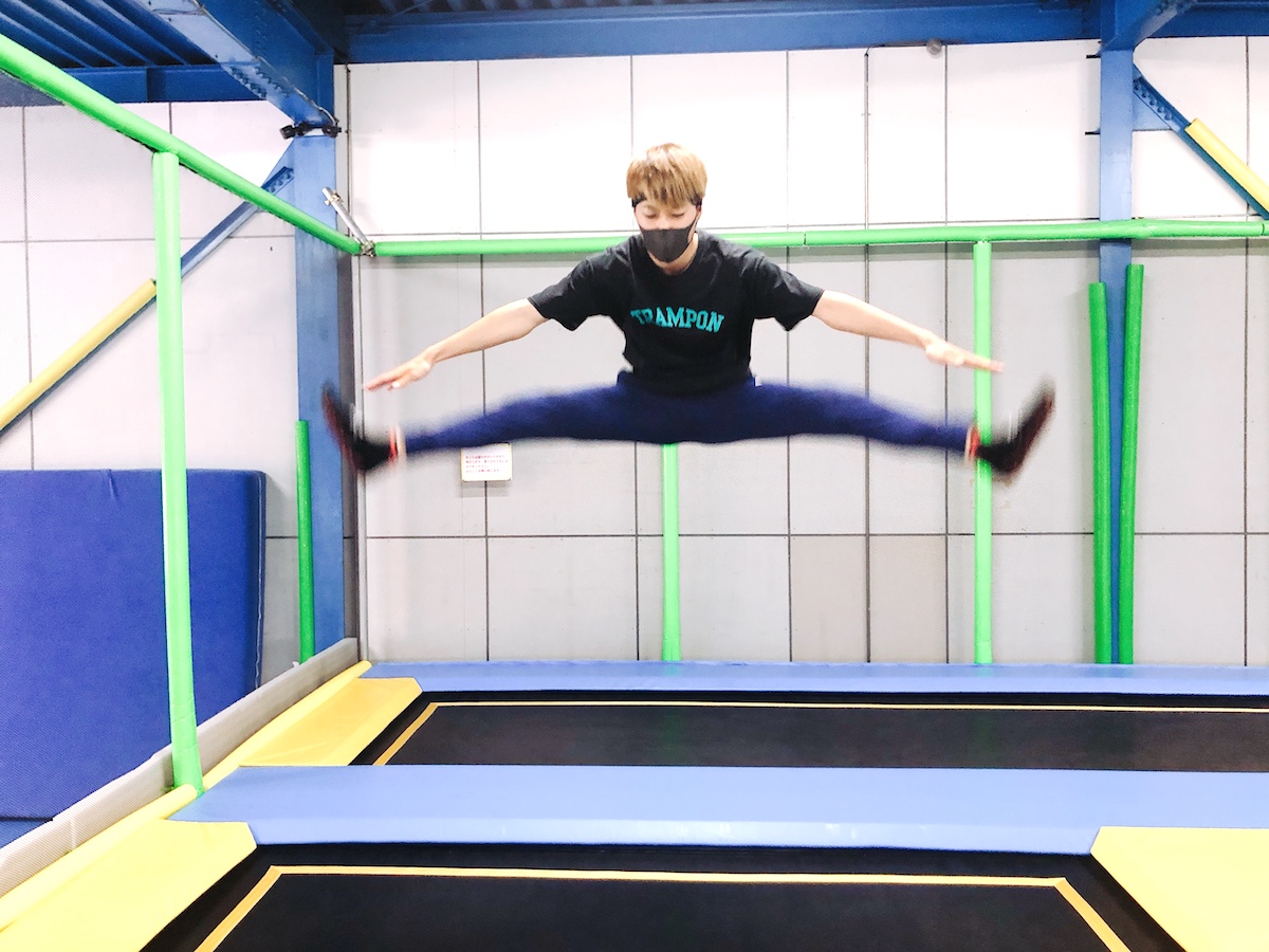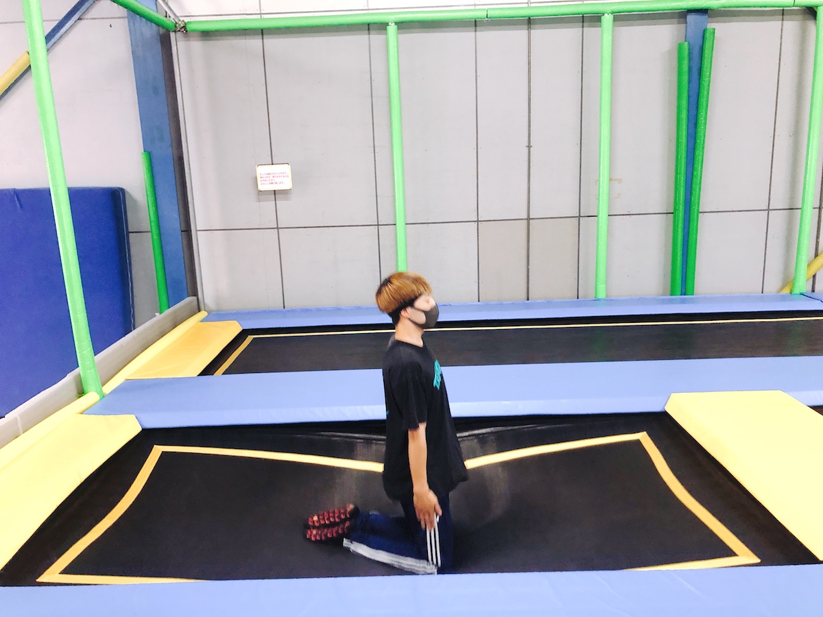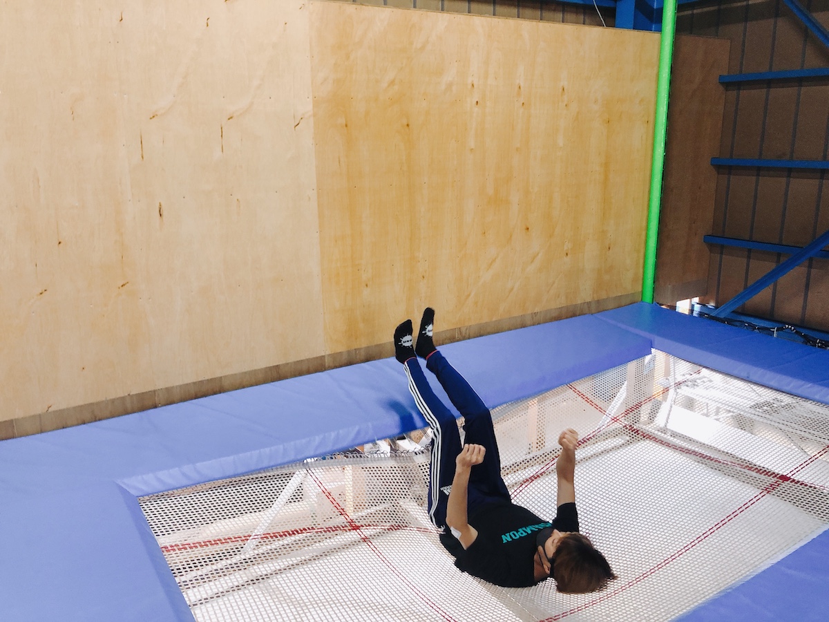基本のトランポリンでコツをつかんだら、スポーツトランポリンへ。競技を目的としたトランポリンで先ほどよりよく跳ねるので、より高く飛ぶことができます。最初の練習でトランポリンに慣れたため、恐怖心はなく、高さを楽しめるようになりました。小さなお子さんでも1m以上跳ぶ子もいるそうなので、どんどん高さに挑戦してみましょう!