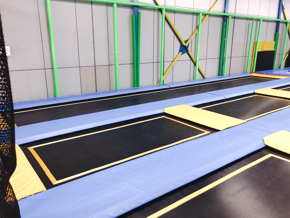 早速トランポリンに挑戦!まずは少し硬くてバネが弱めな黒のトランポリンから始めます。初心者はスタッフがいくつかの跳び方を教えてくれますよ。
