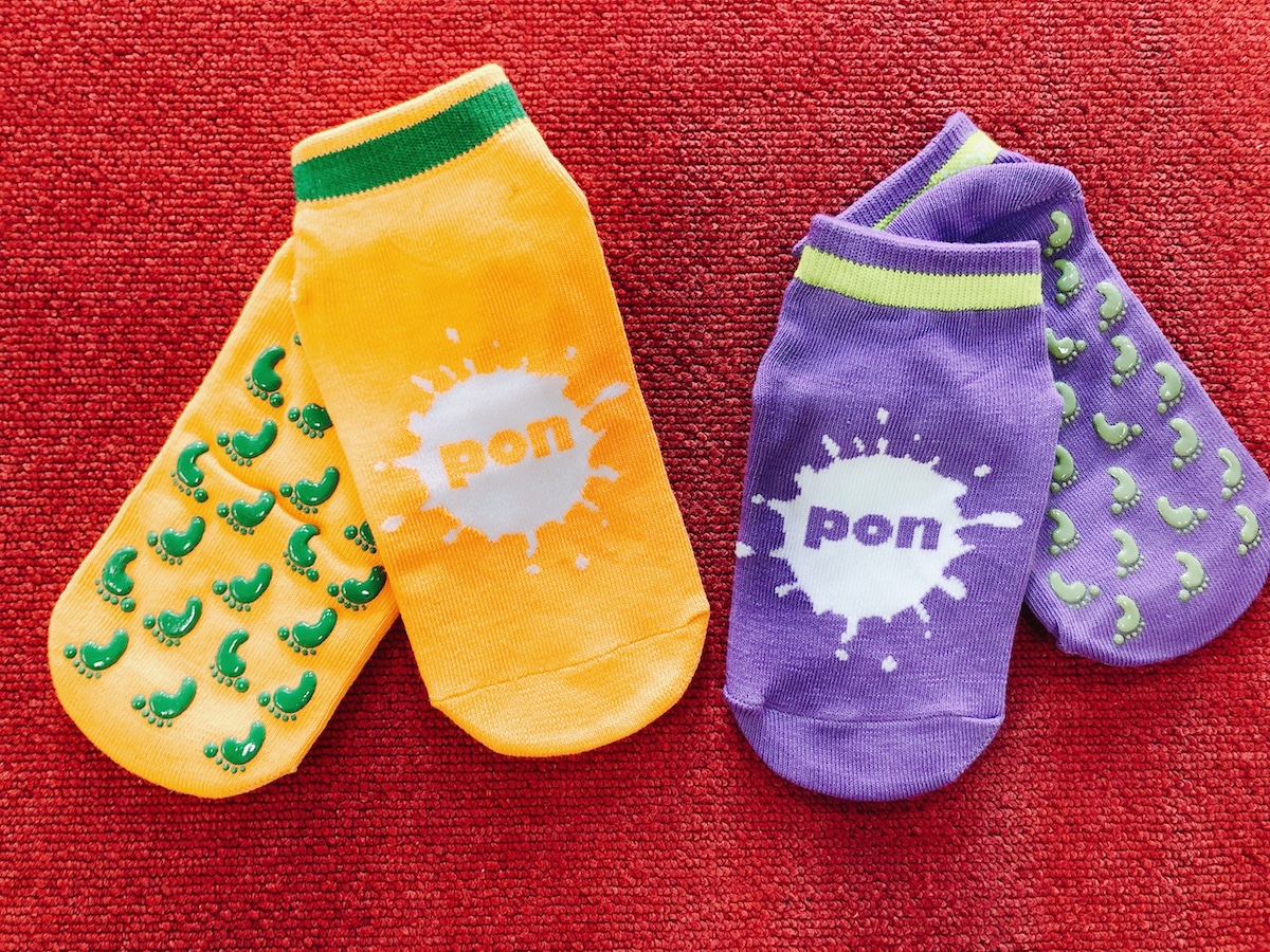 トランポリンに欠かせないのが滑り止め靴下。「TRAMPON」オリジナルのかわいらしい靴下は300円で販売しています。SからLXの4サイズ、全8色とバラエティ豊かな品揃え。かわいくていろんな色を集めたくなりそうです!シューズは不要なので、動きやすい服装に着替えれば準備OK。