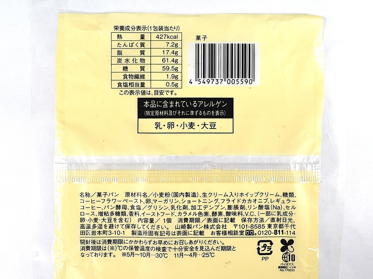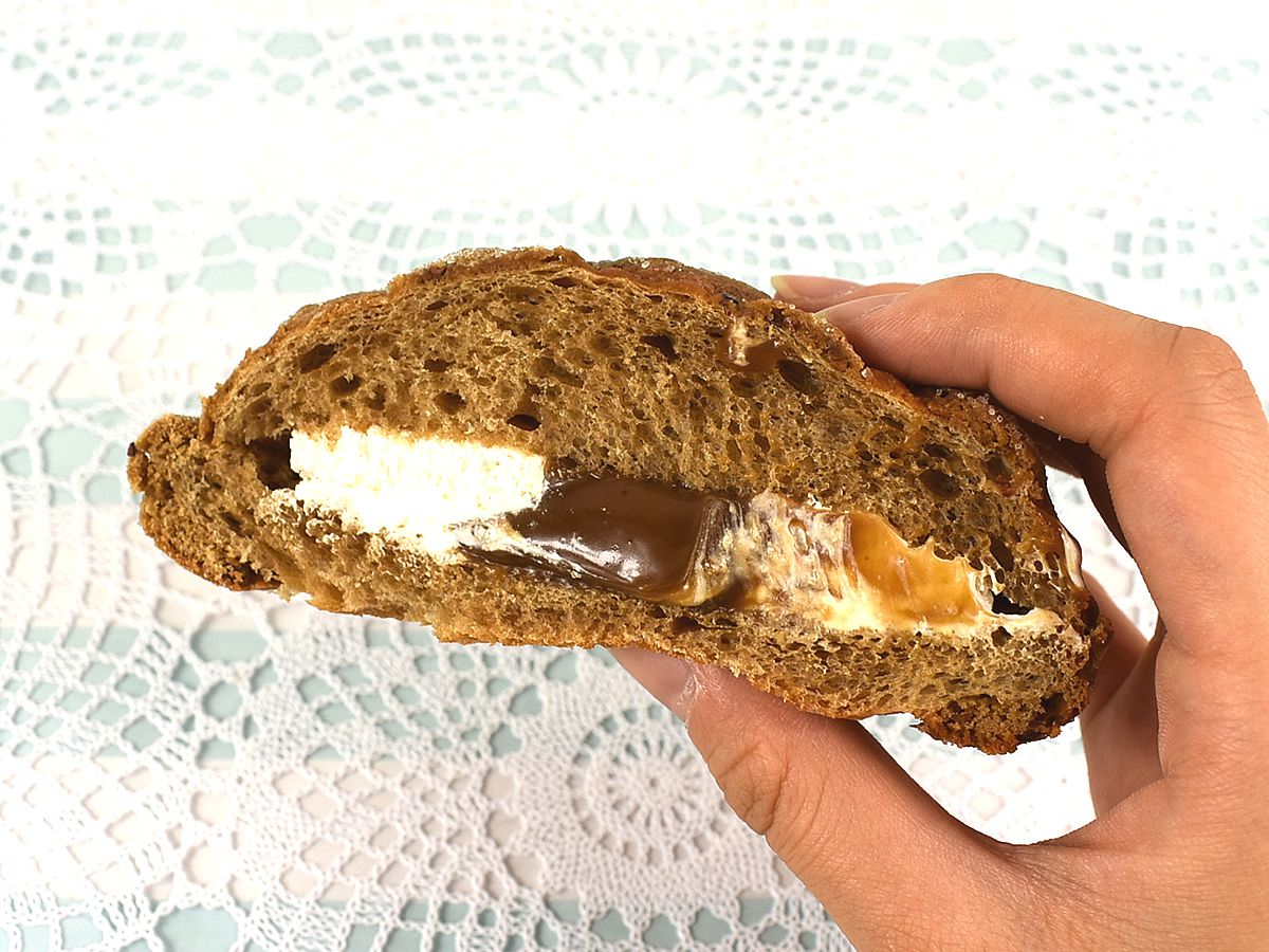 パン生地の中には、さっぱりした甘さのホイップクリームとねっとり濃厚なコーヒークリームがたっぷり。半分に切った断面からこぼれ出しそうなクリームに頬が緩みます。どちらも北海道産生クリームを使用しているため、甘みの中にも深~いコクが堪能できます。甘さ控えめなパン生地との相性も抜群で、クリームをたくさん入れたカフェラテのような優しい味わいが楽しめます。