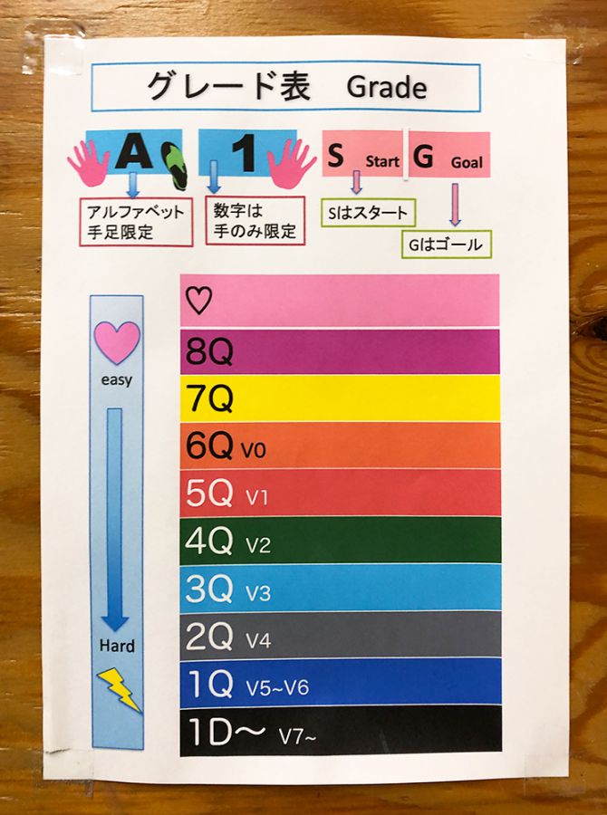テープの色が表しているのは難易度。比較的簡単なピンク(ハートマーク)、パープルの8QからレベルアップするごとにQが上がっていき、1Q、1D~と続きます。グレード表が貼ってあるので、それを見ながら自分に合ったレベルのコースを選んで登ります。