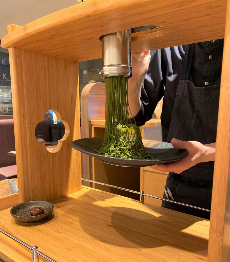 メレンゲ、生クリーム、ジェノワーズの3層からなる土台に、直径約1mmの抹茶のモンブランクリームを、ぐるぐるとまわしかけ、目の前で仕上げられていきます。