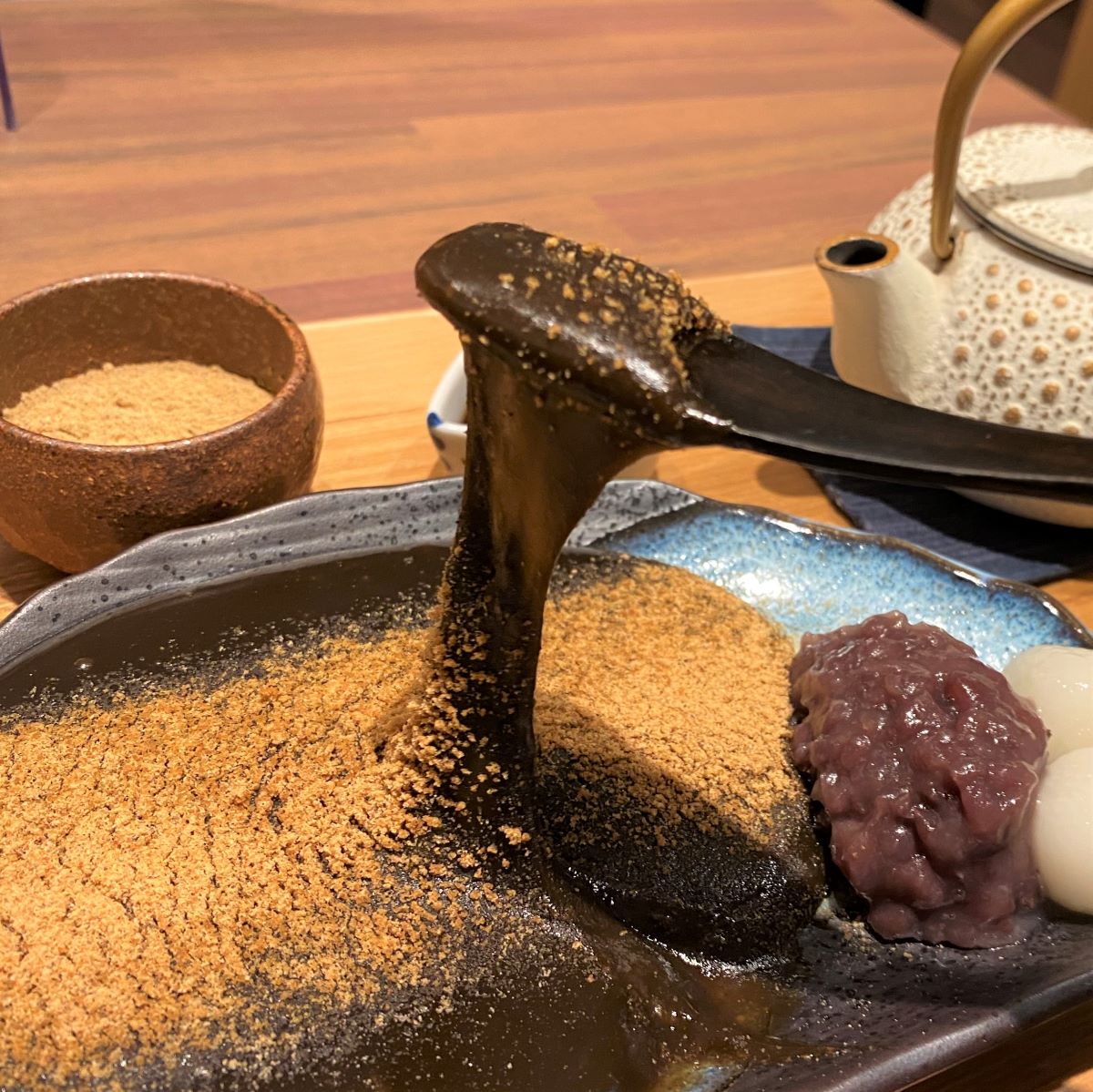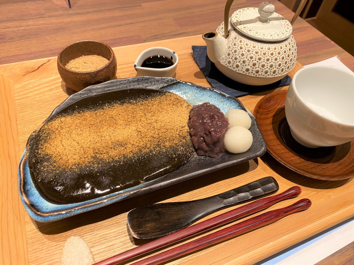 匙ですくってみるととろ~りと伸びます。つるんとのど越しがよく、玉露ほうじ茶の風味をしっかり感じられ、きなこと黒蜜で上品な甘さに仕上がる逸品。「京都 茶寮翠泉」の看板をはるのもうなずける、納得のおいしさです!