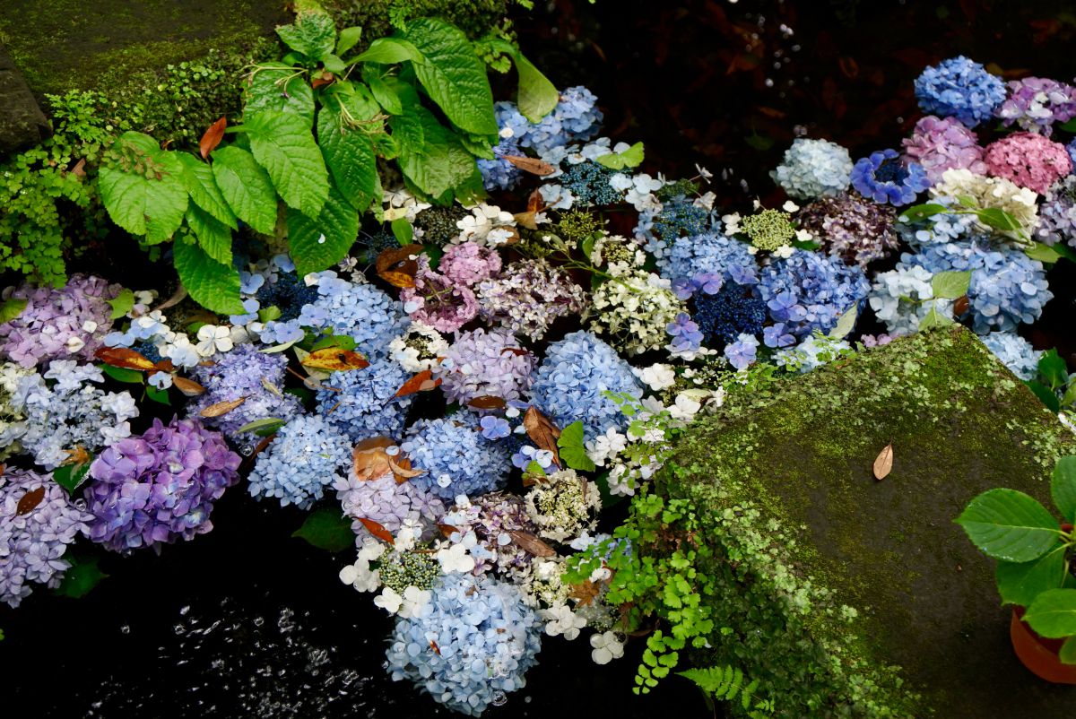 長谷寺のアジサイは例年、5月下旬から7月上旬にかけてがシーズン。今年は例年より1週間ほど早く咲き始め、見頃も早く終わりを迎えそうですが、この時期には境内にある眺望散策路、通称「あじさい路」で青や紫、ピンクのアジサイを観賞できます。それだけでなく、アジサイは和み地蔵のそばに置かれたり、池に浮かべられたり、仏像に抱えられたり……と境内のあちこちに。気分を高揚させながら、境内の奥に延びる花道へと足を運びましょう。