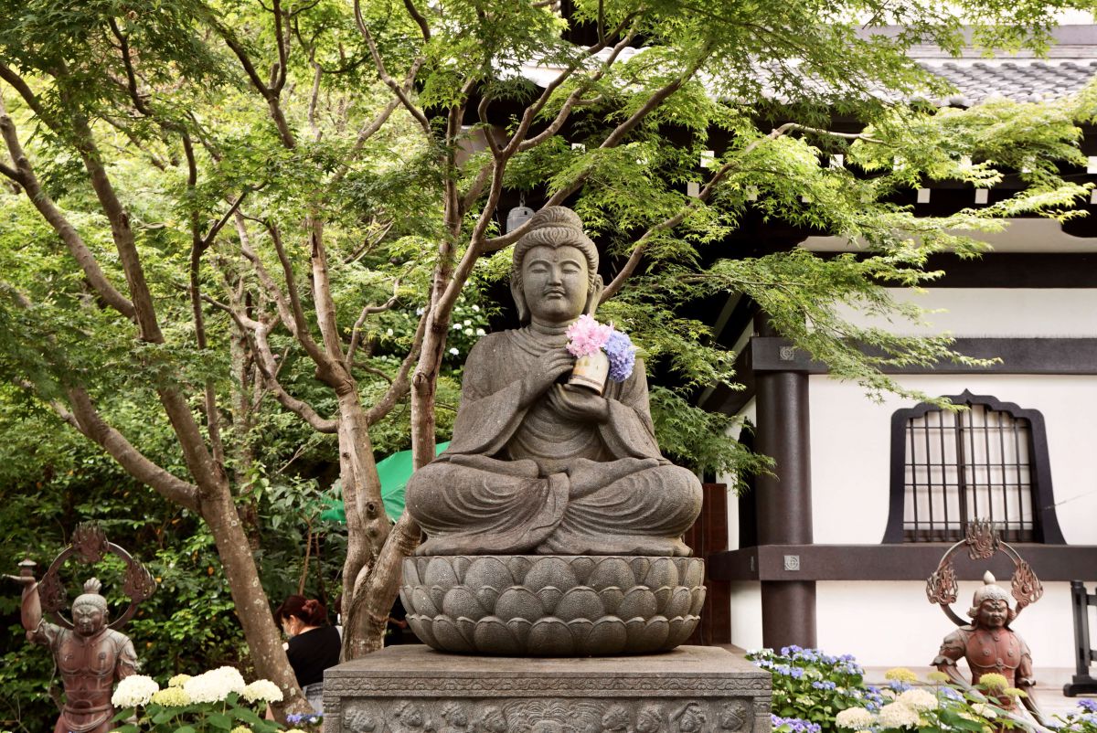 もうひとつ、あじさい路で見逃すわけにはいかないのが良縁地蔵。あじさいに囲まれた表情はにこやかで、やさしさも感じられます。