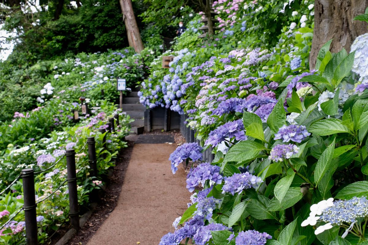 一方、上の道を進めば、アジサイ越しに鎌倉の町、そして相模湾まで一望できます。アジサイのみどころが豊富な鎌倉とはいえ、海と一緒に観賞できる場所はそう多くありません。アジサイ観賞に夢中になりつつも、上下どちらの道も見逃さないように歩きましょう。